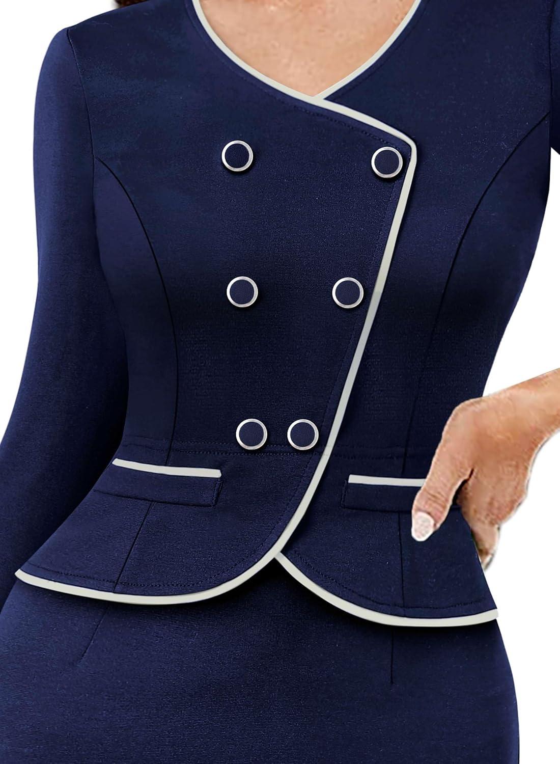 VFSHOW Womens 2024 Fall Work Business Dresses Double Breasted V Neck Office Slimming Peplum Pencil Sheath Dress(Navy Blue+ivory Piping)