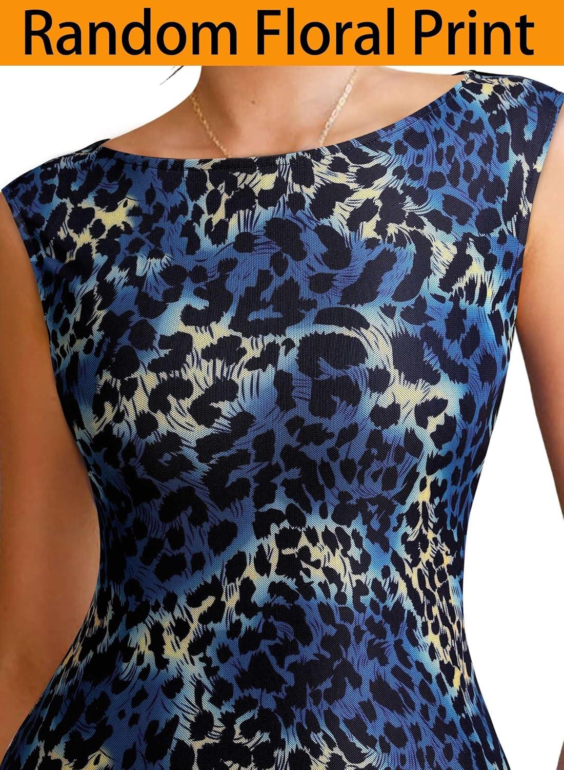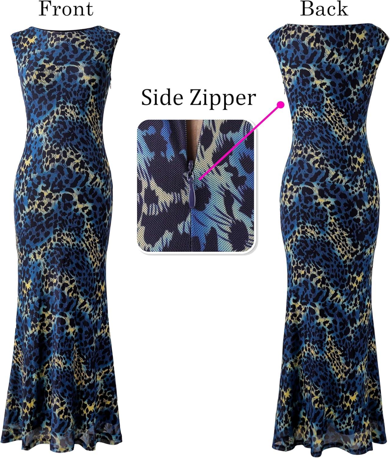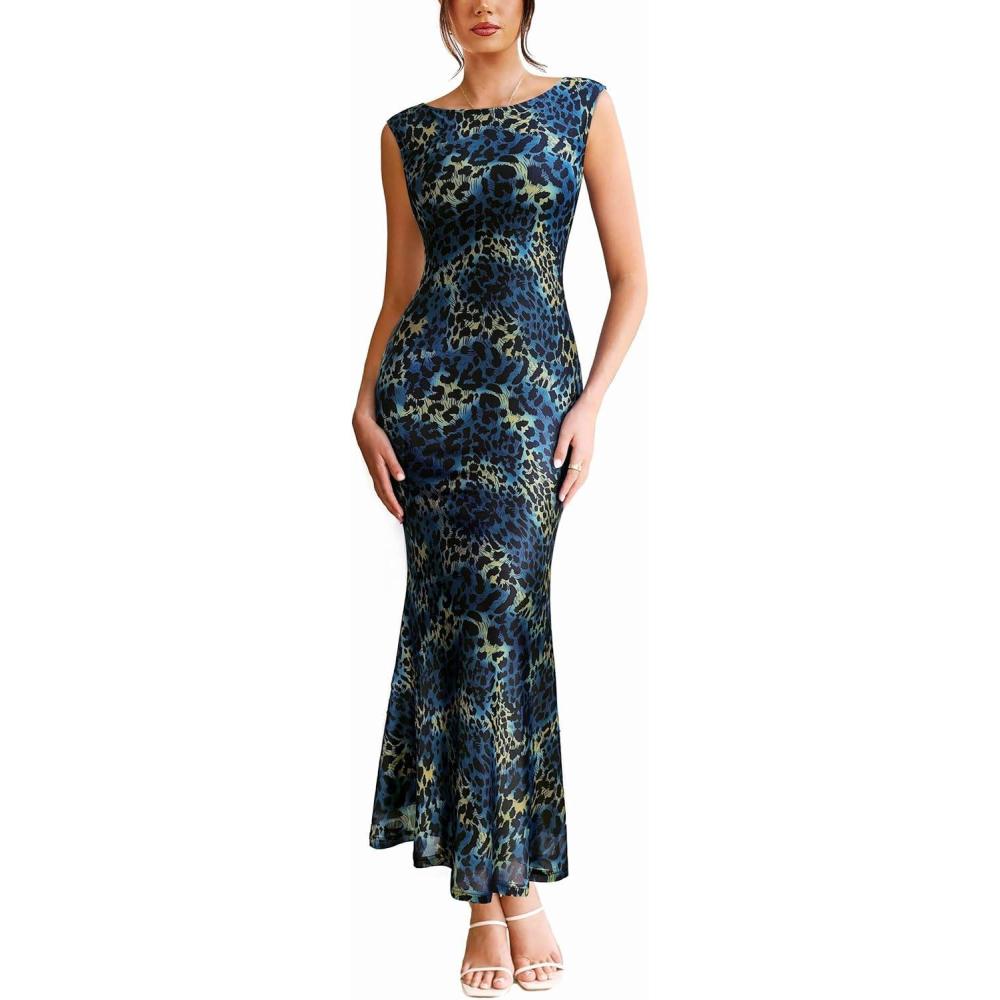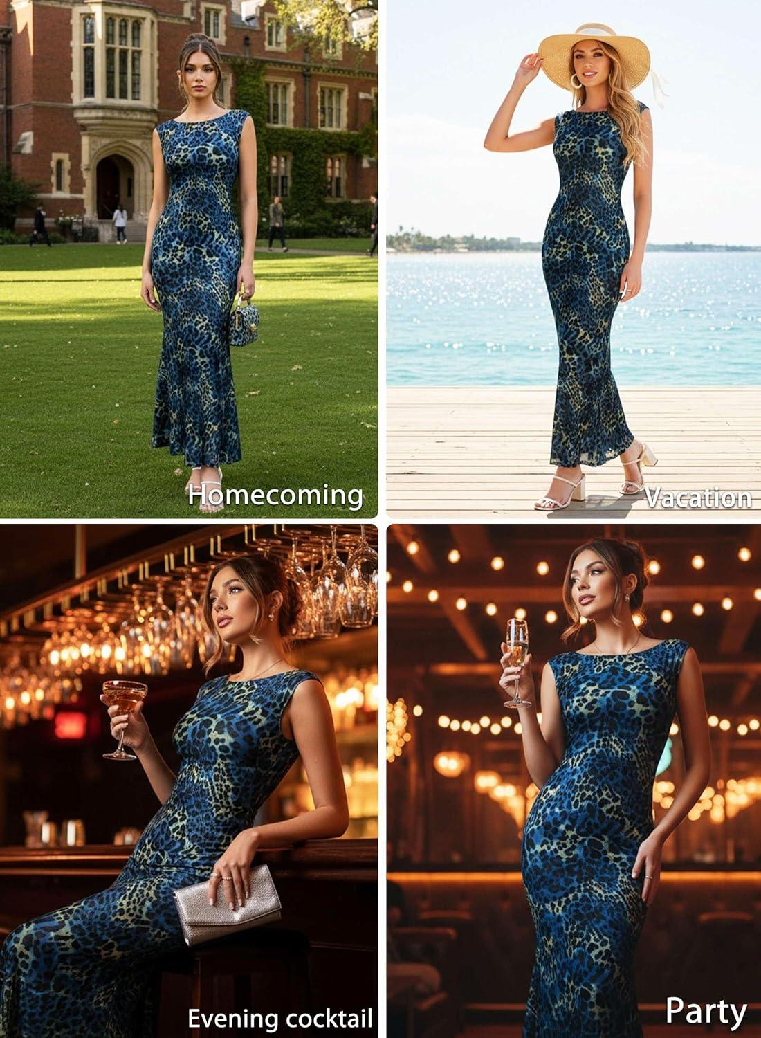 VFSHOW Womens 2025 Boat Neck Formal Bodycon Maxi Dress Sleeveless Slim Fitted Wedding Guest Long Cocktail Mermaid Dresses(Blue and Black Leopard Print)