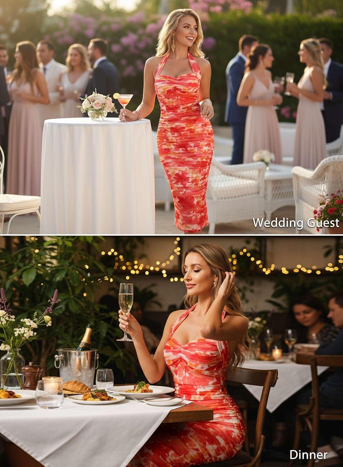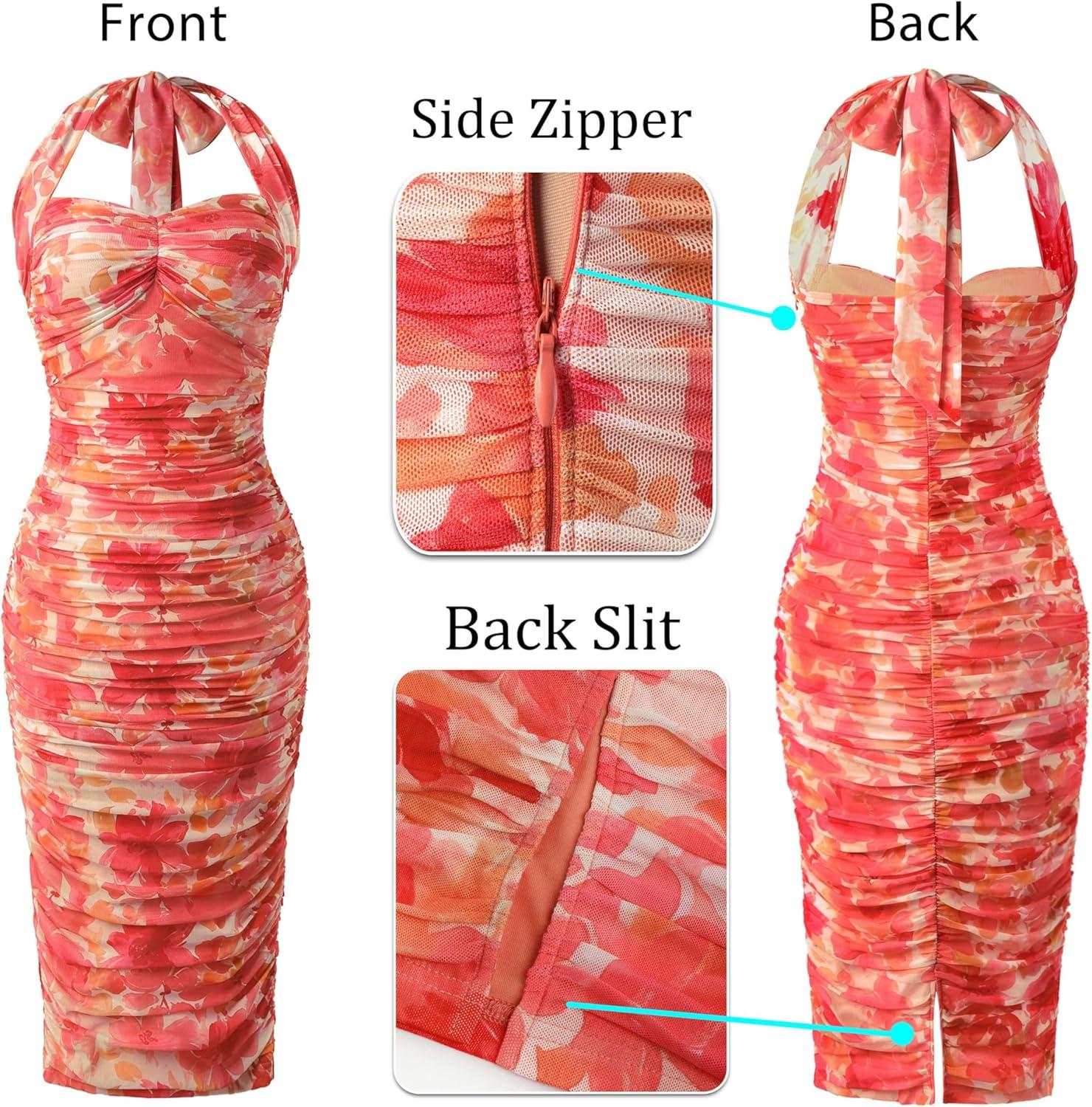 VFSHOW Womens 2025 Halter Off Shoulder Cocktail Ruched Bodycon Midi Dress Sexy Backless Slim Fitted Wedding Guest Dresses(Orange Floral Print)