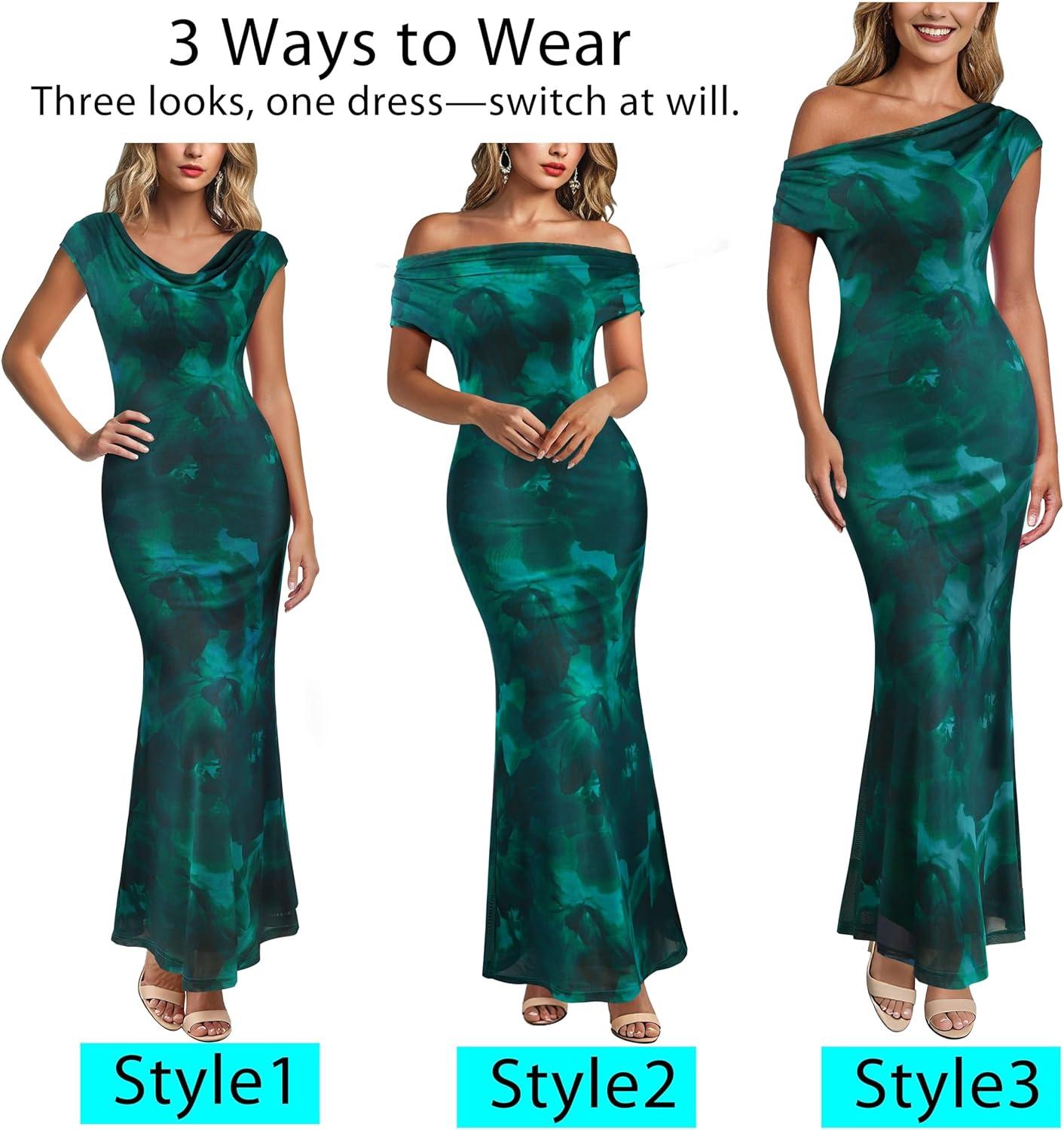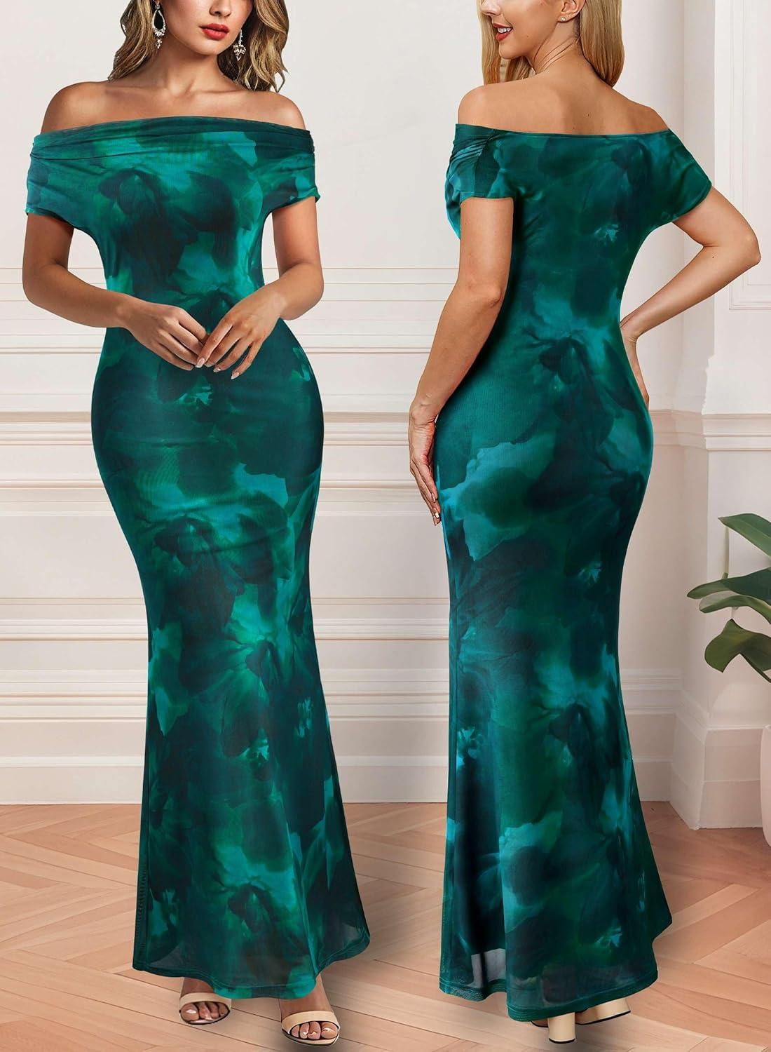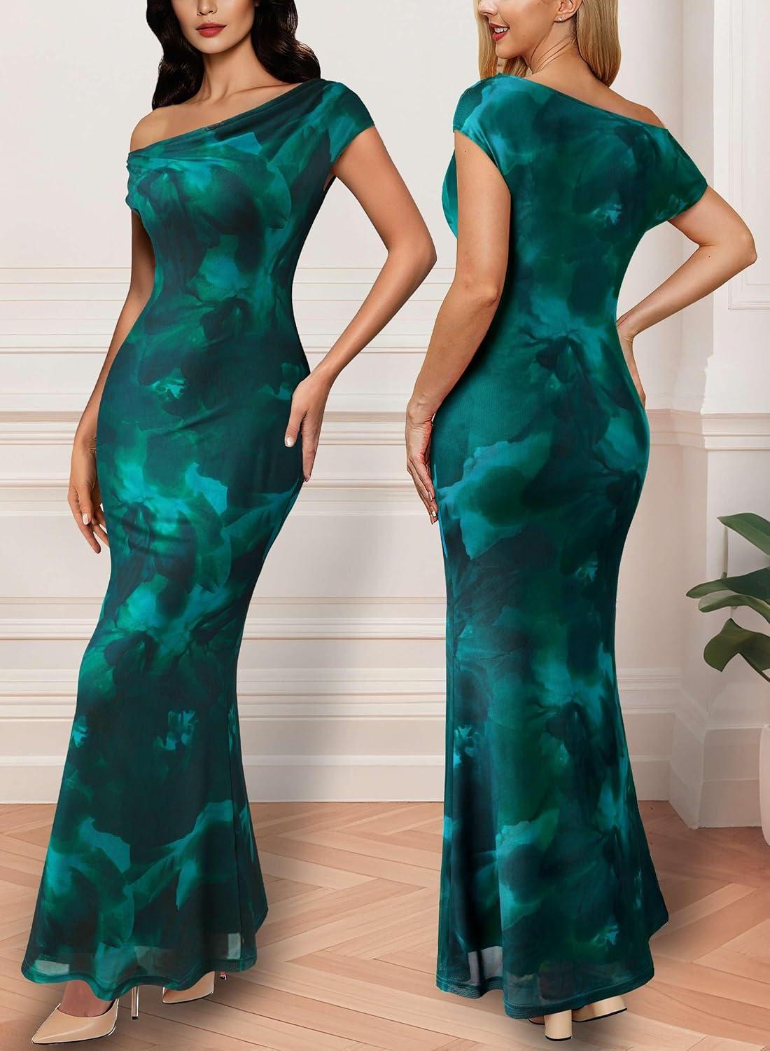 VFSHOW Womens 2025 One Shoulder Wedding Guest Bodycon Maxi Dress Sexy Off The Shoulder Fitted Formal Long Cocktail Dresses(Green Floral Print)