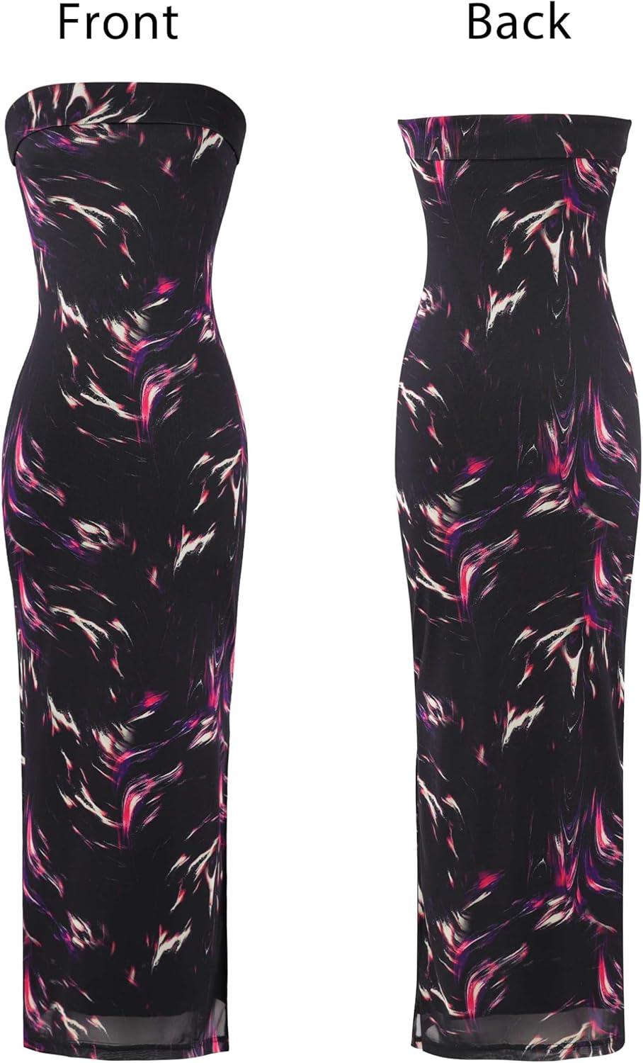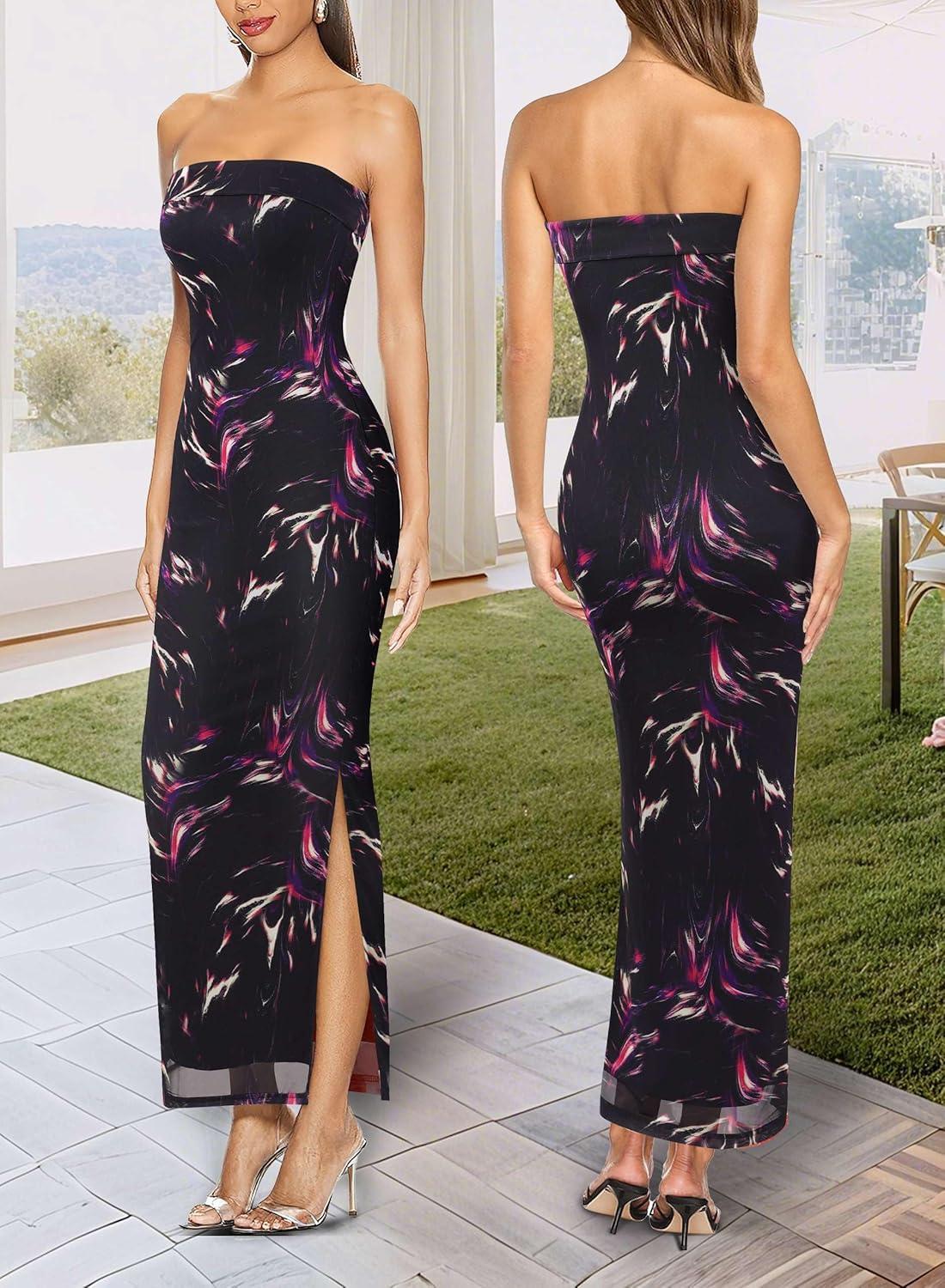 VFSHOW Womens 2025 Sexy Backless Formal Tube Bodycon Maxi Dress Strapless Side Slit Beach Wedding Guest Long Cocktail Dresses(Black With Purple Abstract Print)