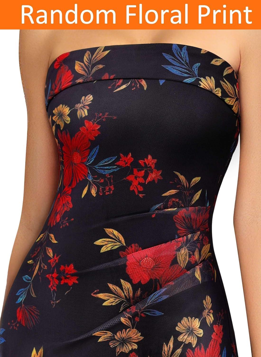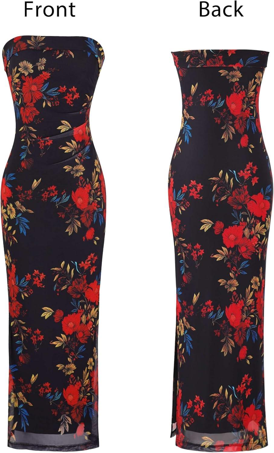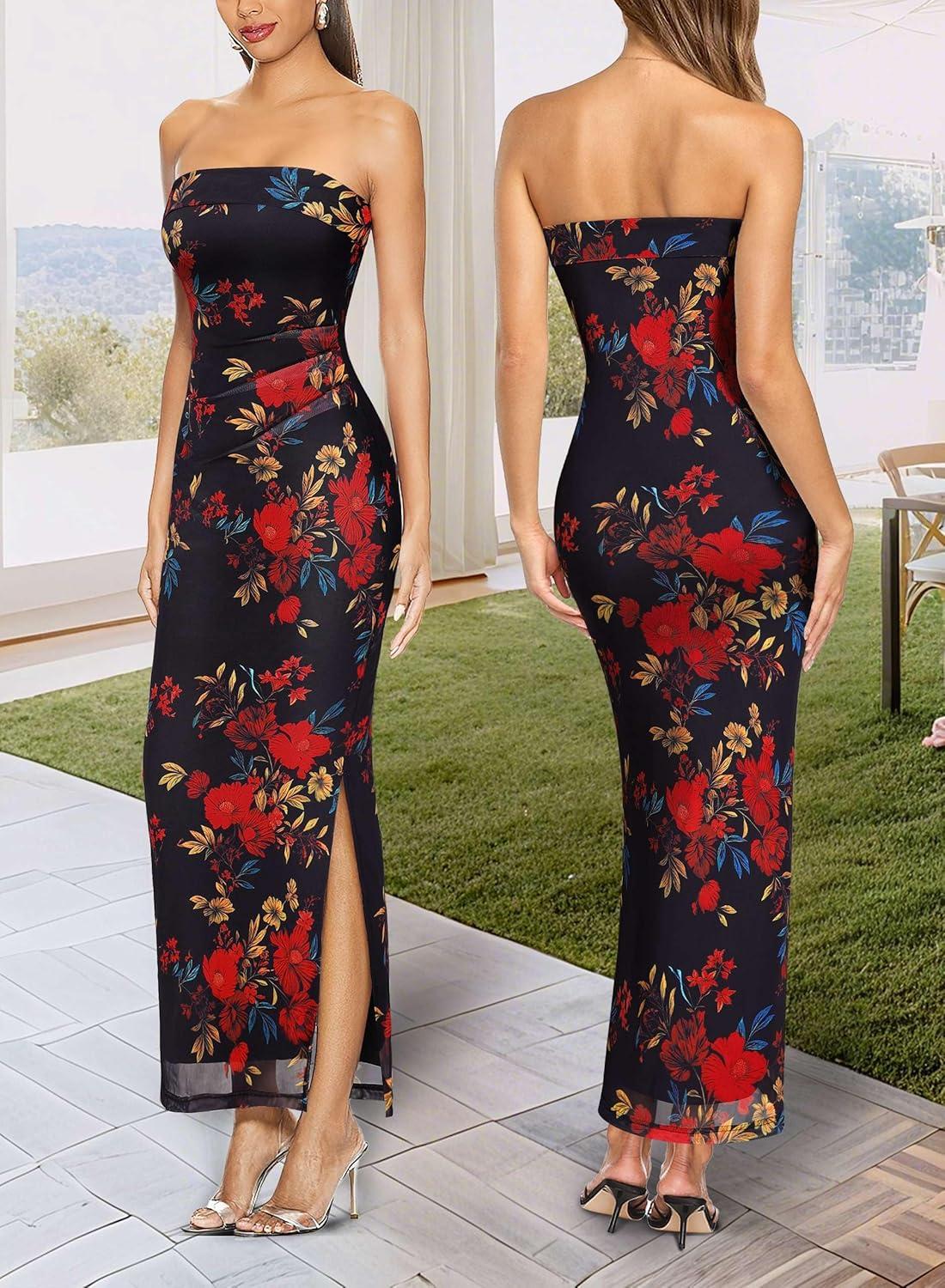 VFSHOW Womens 2025 Sexy Backless Formal Tube Bodycon Maxi Dress Strapless Side Slit Beach Wedding Guest Long Cocktail Dresses(Black With Red Floral Print-b)