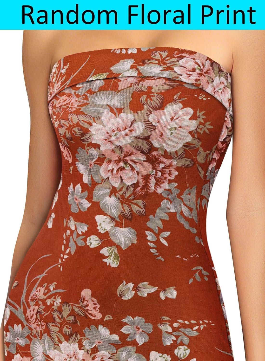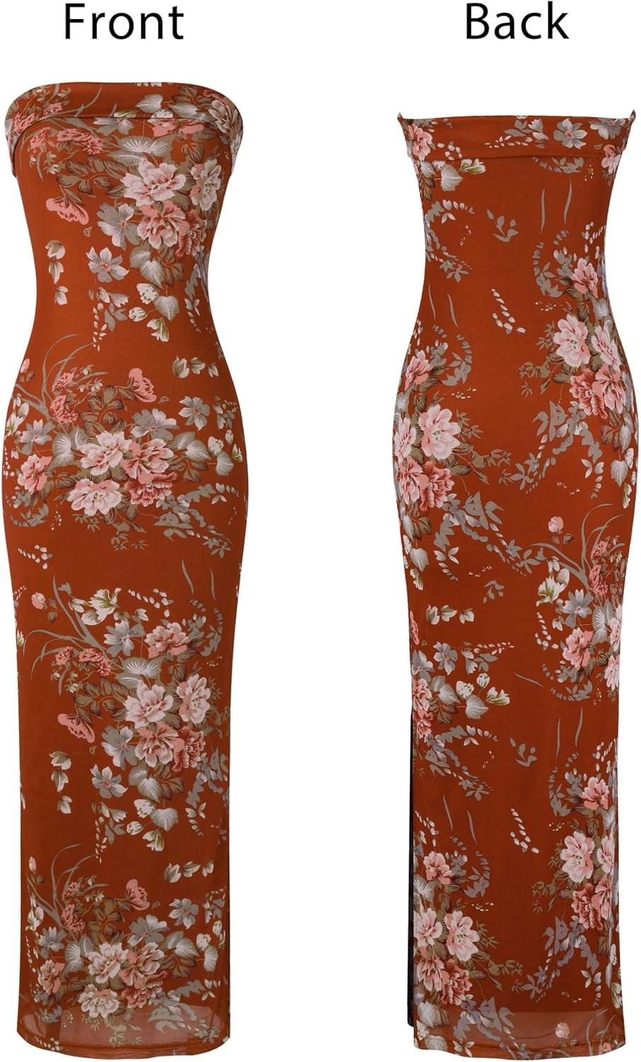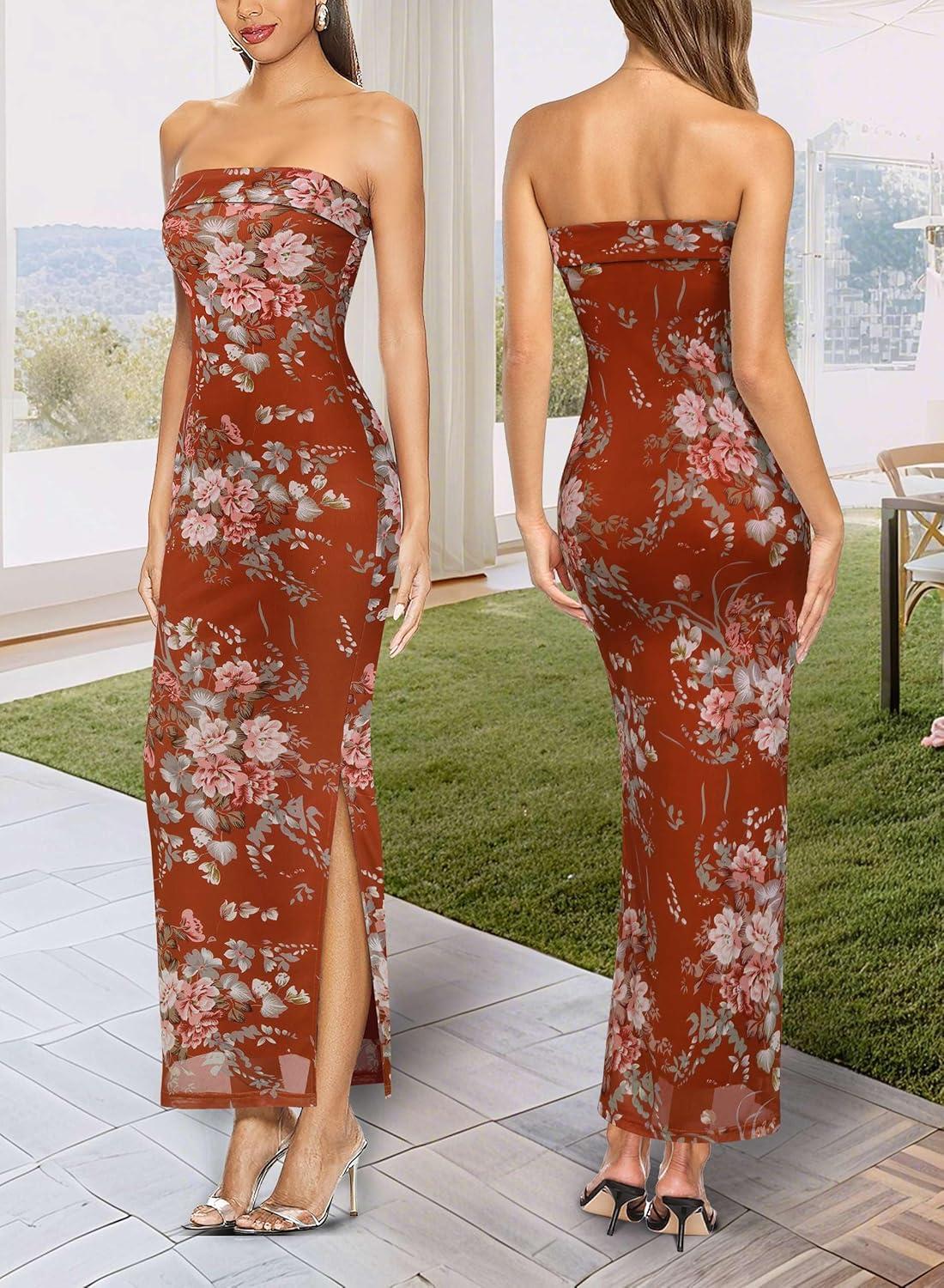 VFSHOW Womens 2025 Sexy Backless Formal Tube Bodycon Maxi Dress Strapless Side Slit Beach Wedding Guest Long Cocktail Dresses(Rust Red Floral Print)