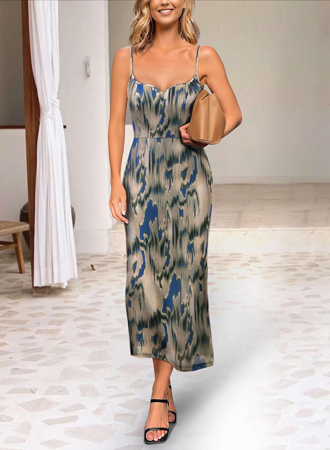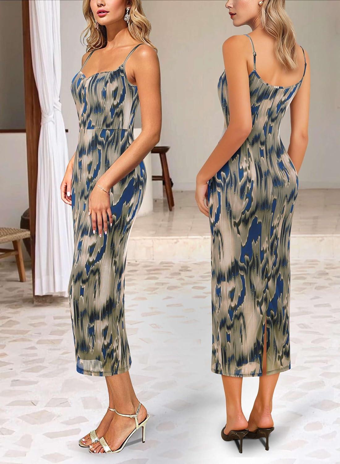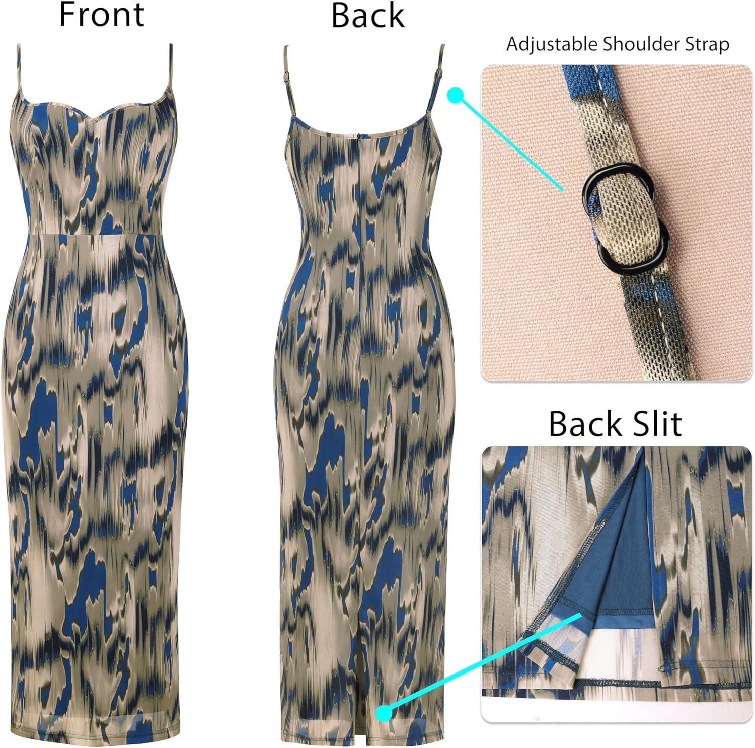 VFSHOW Womens 2025 Spaghetti Strap Cocktail Bodycon Midi Dress Sexy Backless Sweetheart Neck Wedding Guest Mid-Calf Dresses(Blue Abstract Print)