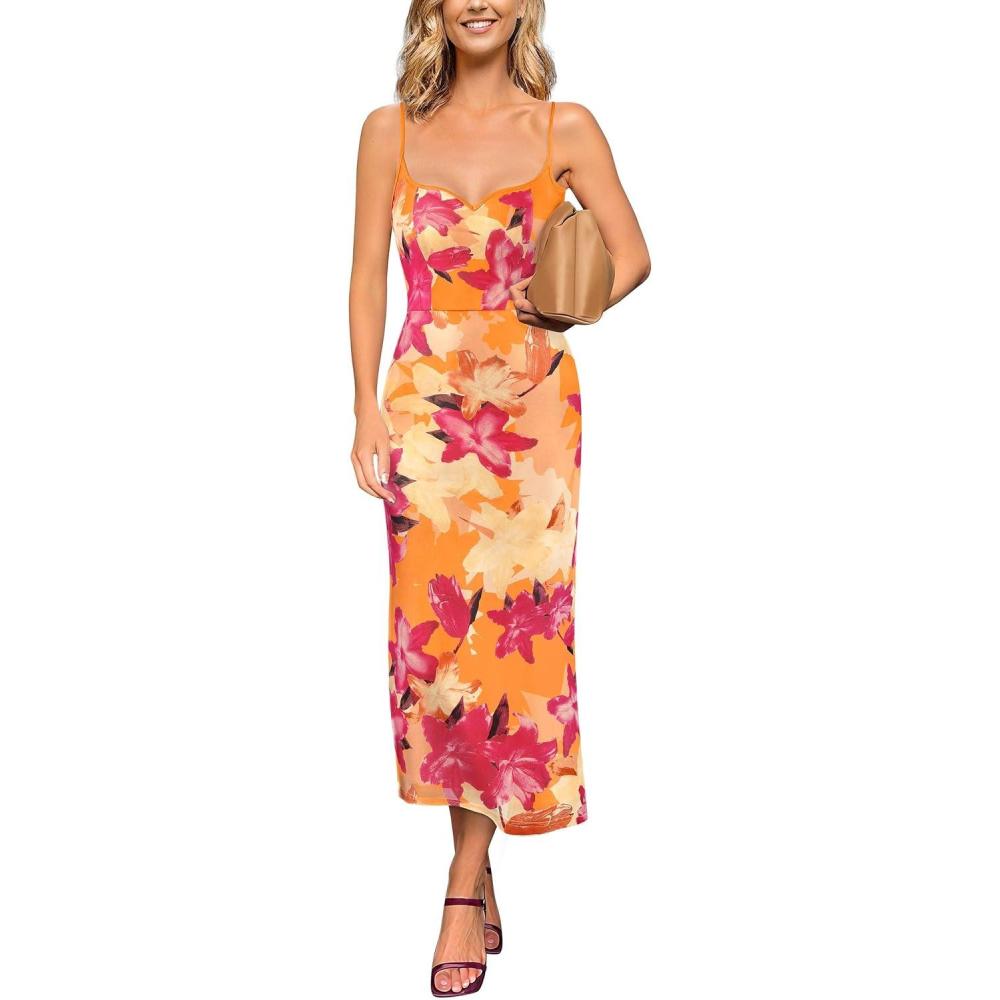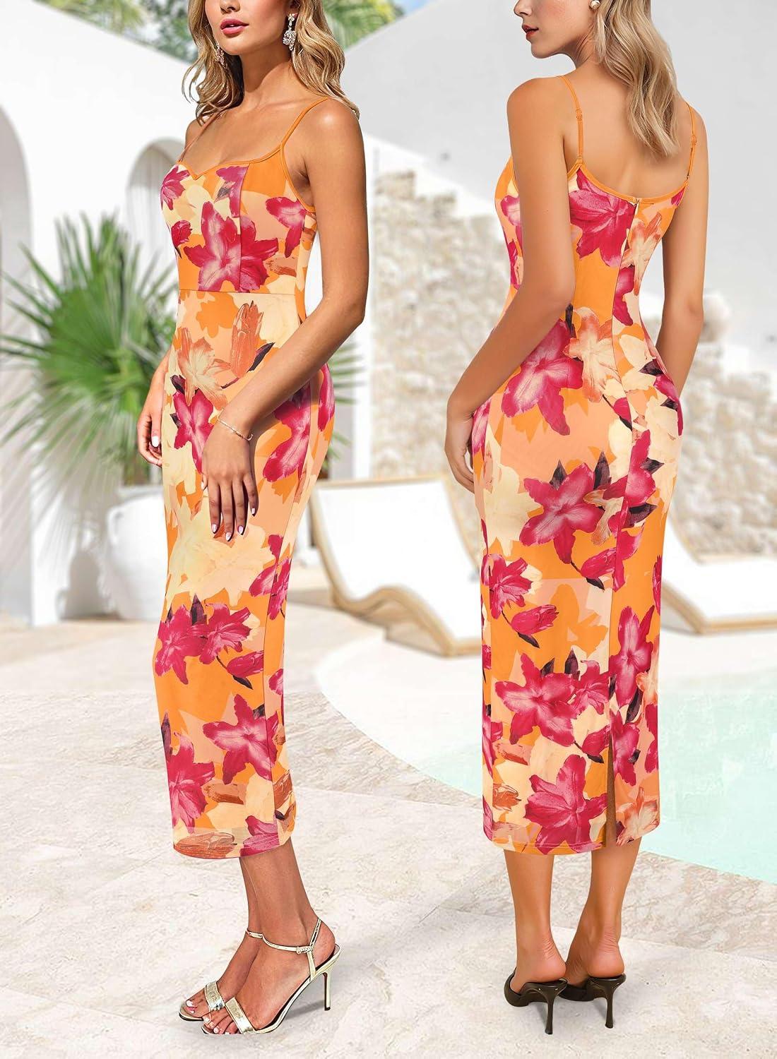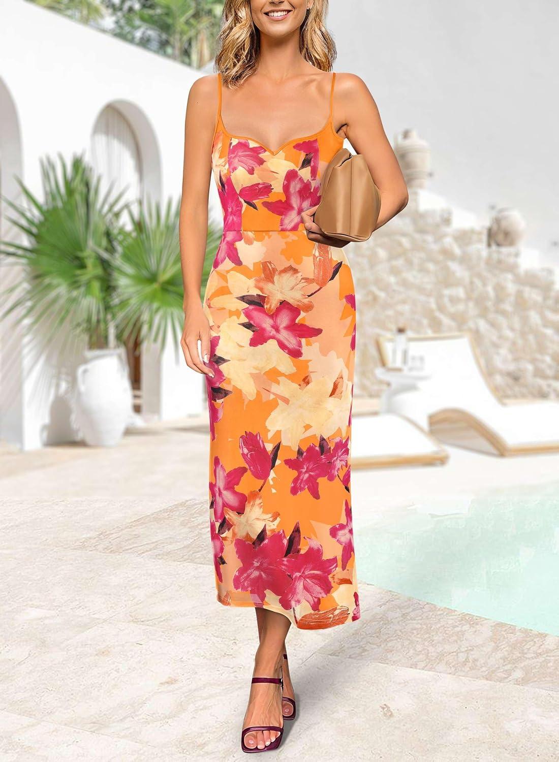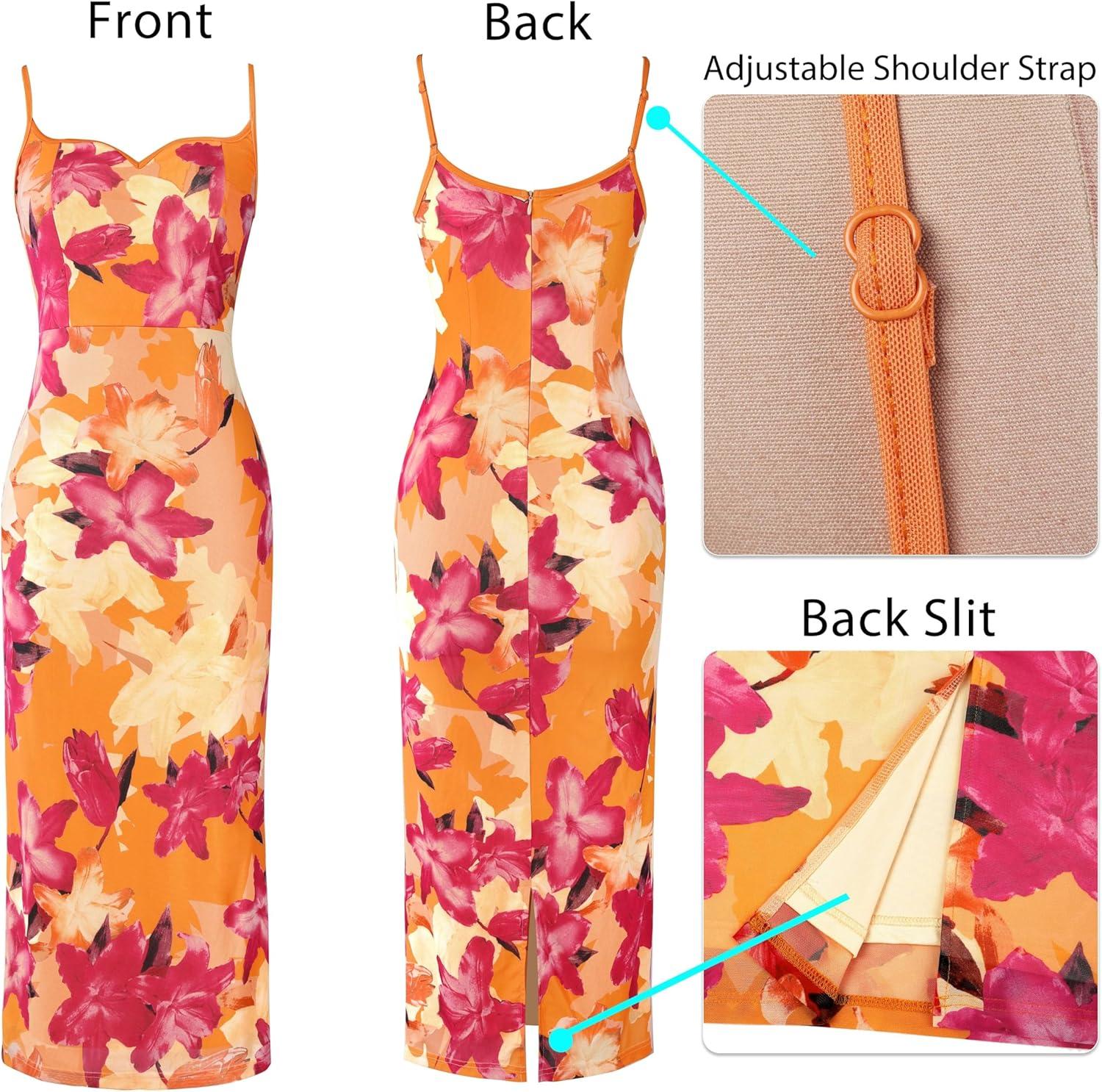 VFSHOW Womens 2025 Spaghetti Strap Cocktail Bodycon Midi Dress Sexy Backless Sweetheart Neck Wedding Guest Mid-Calf Dresses(Orange Floral Print-b)