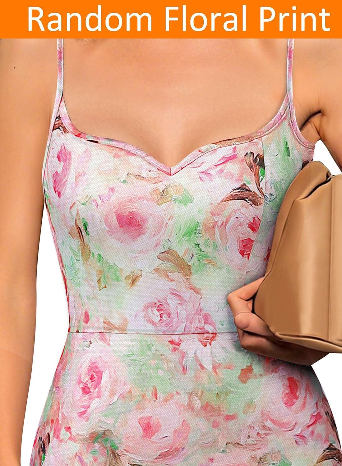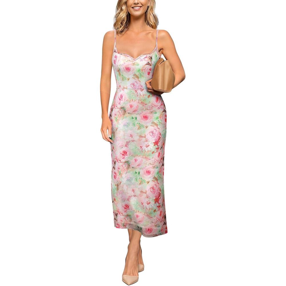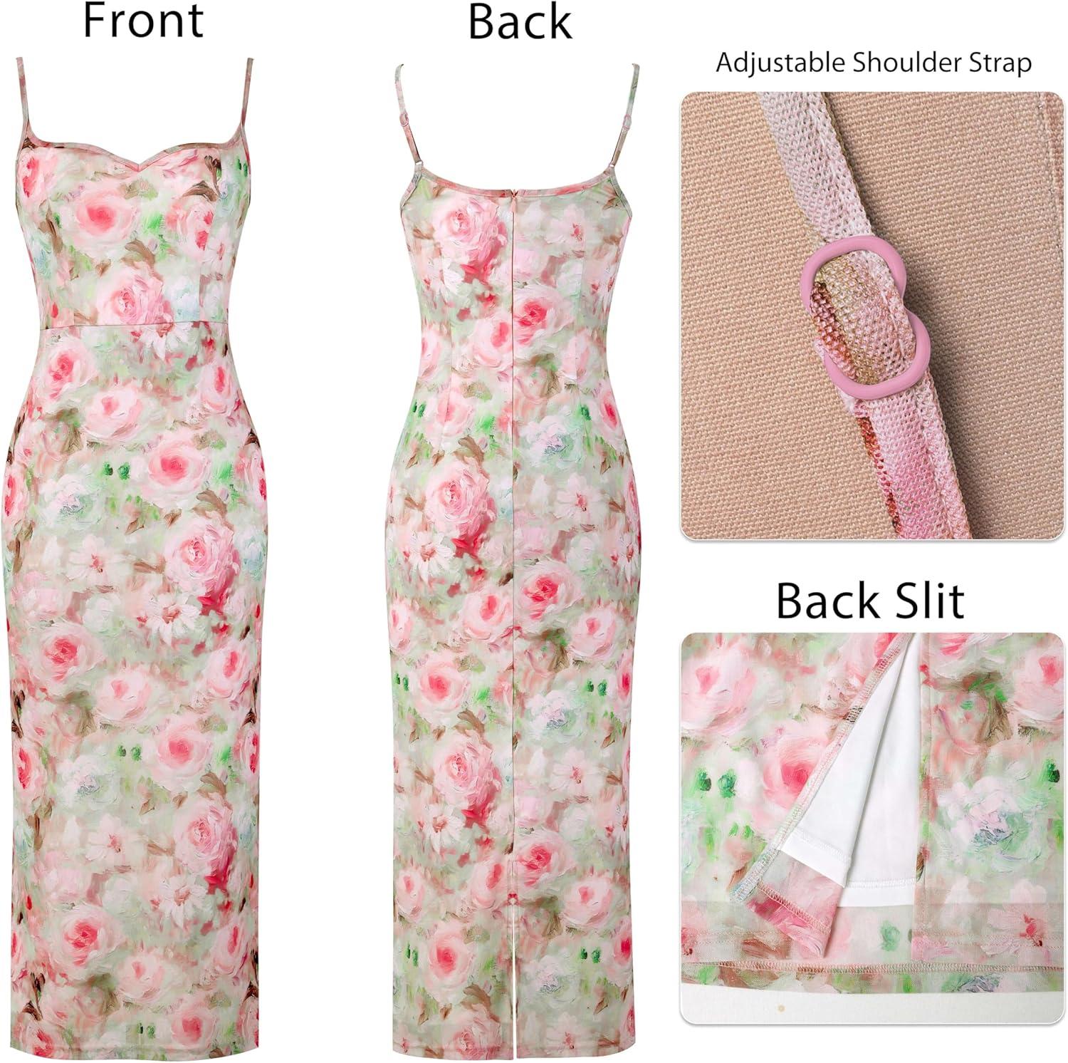VFSHOW Womens 2025 Spaghetti Strap Cocktail Bodycon Midi Dress Sexy Backless Sweetheart Neck Wedding Guest Mid-Calf Dresses(Pink Floral Print)