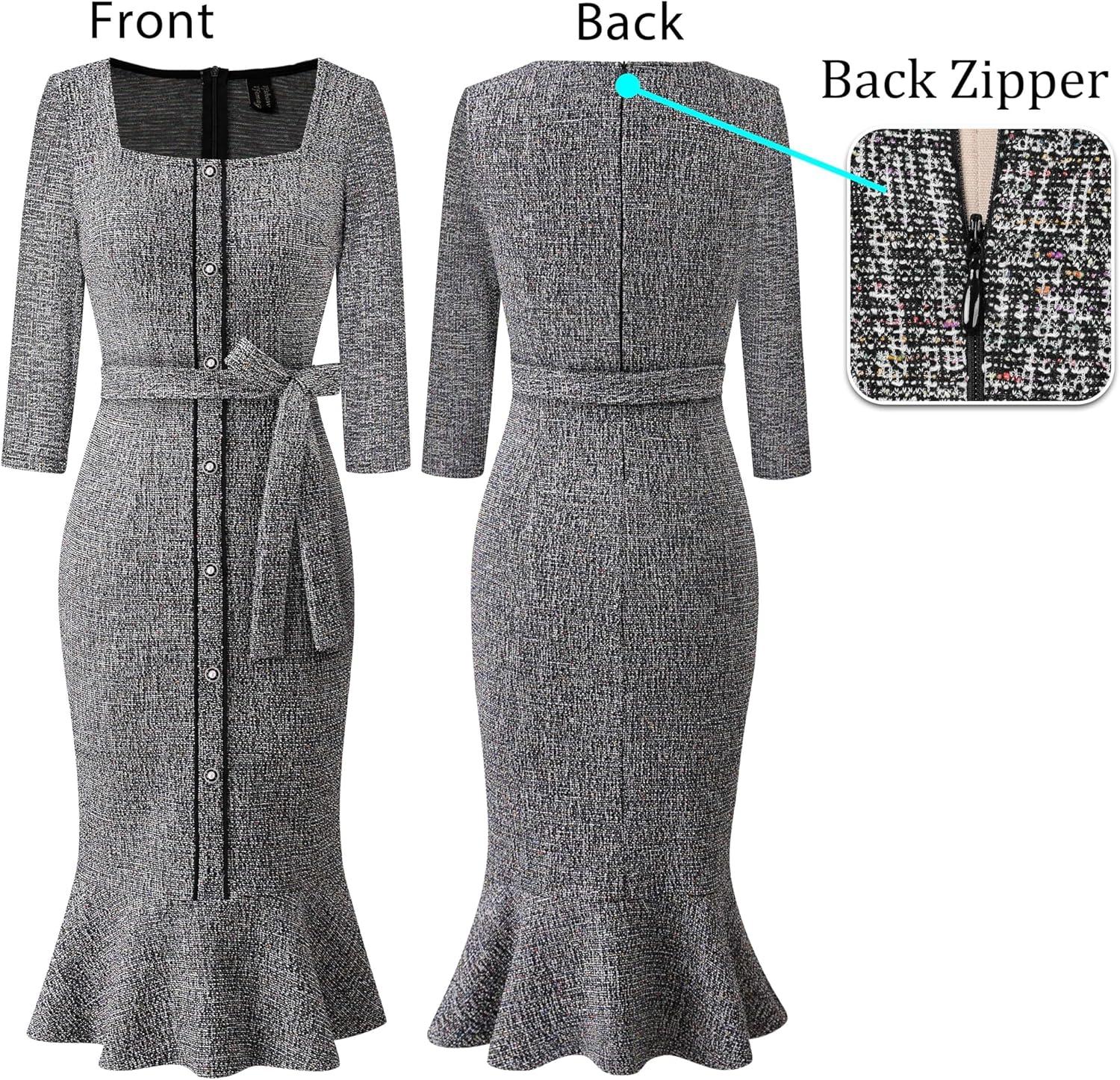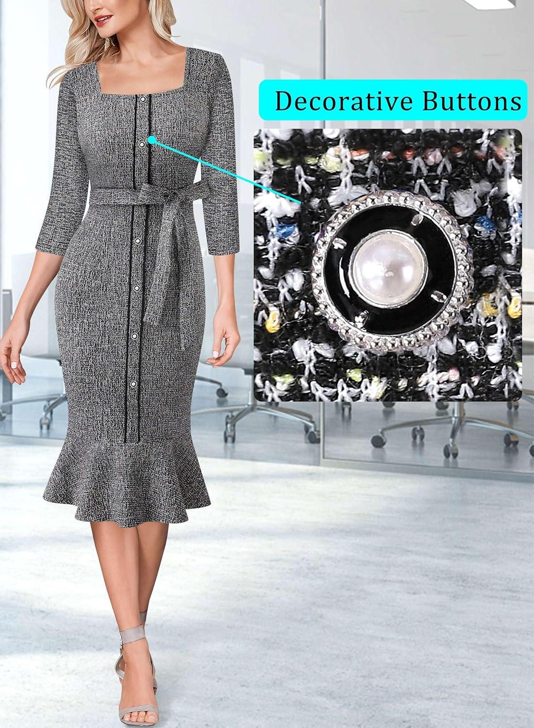 VFSHOW Womens Business Square Neck Button Belted Colorblock Patchwork Office Work Slim Sheath Mermaid Dress(Black Tweed)