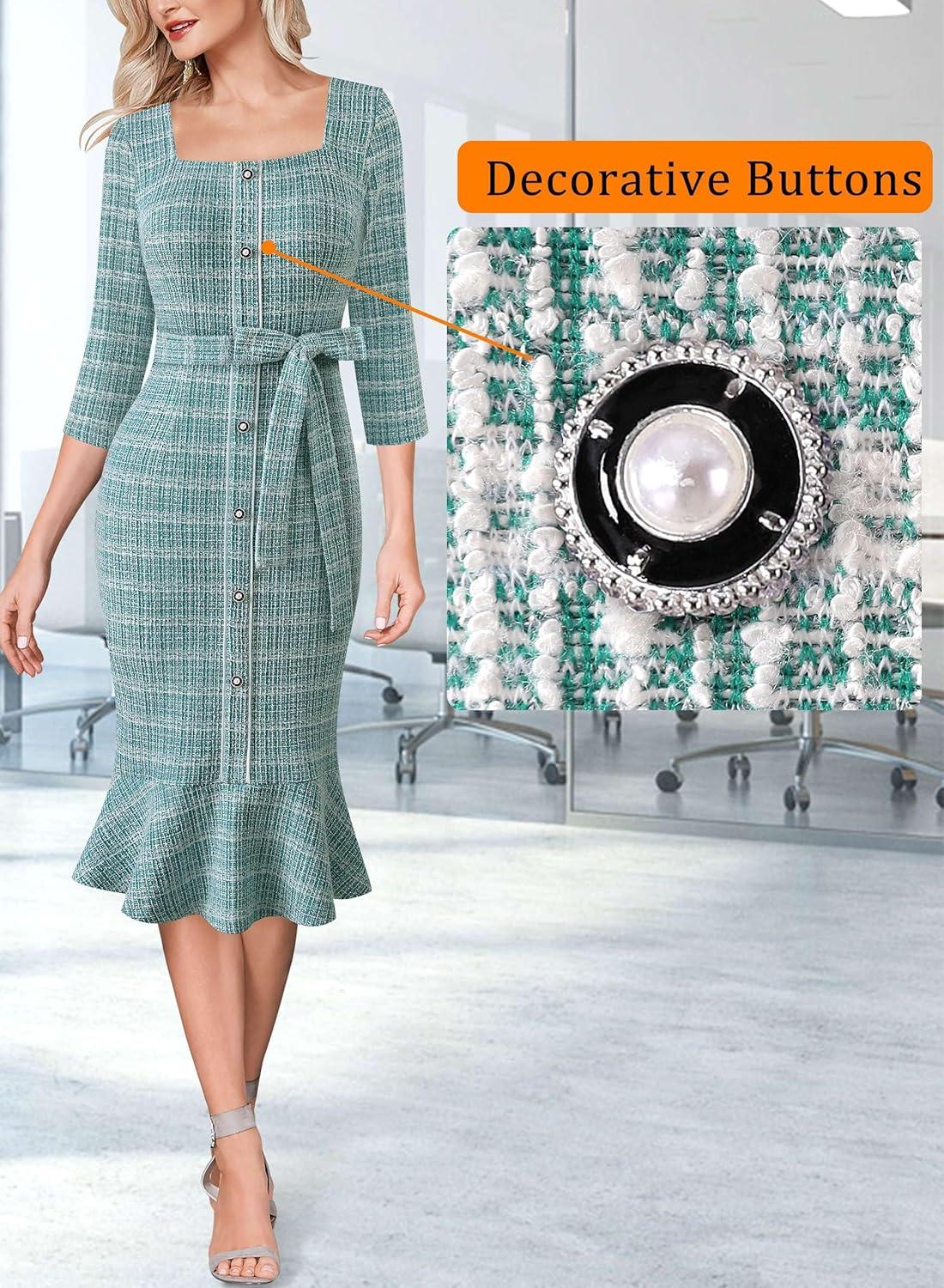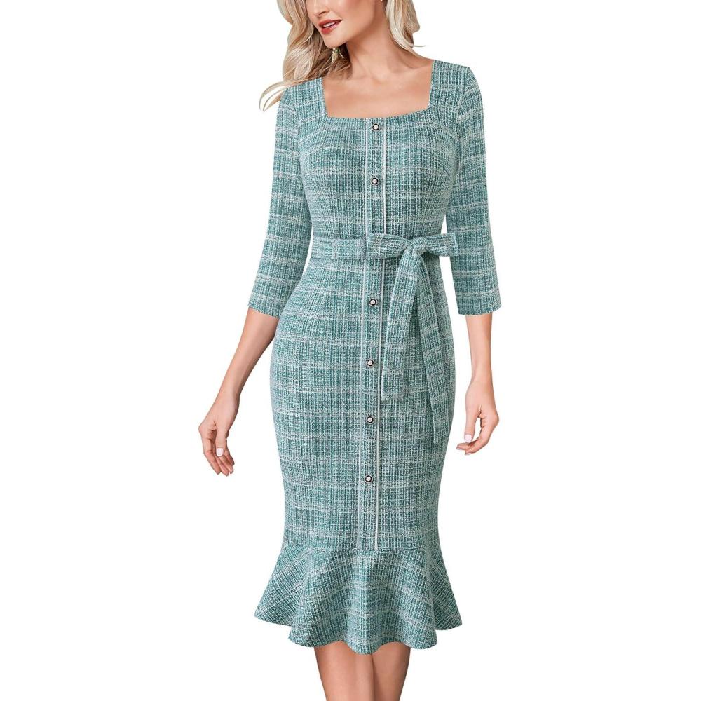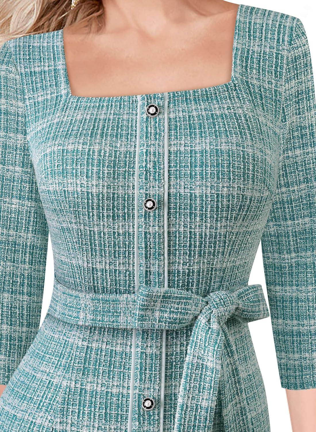 VFSHOW Womens Business Square Neck Button Belted Colorblock Patchwork Office Work Slim Sheath Mermaid Dress(Teal Green Tweed)