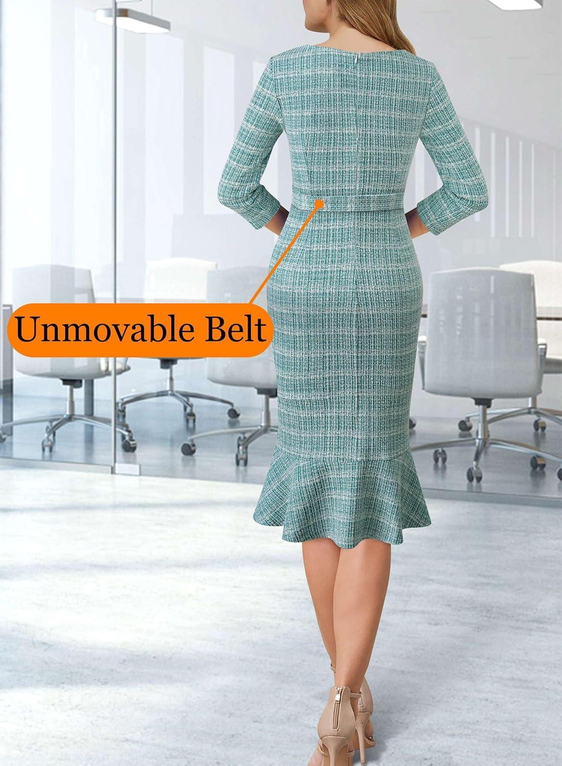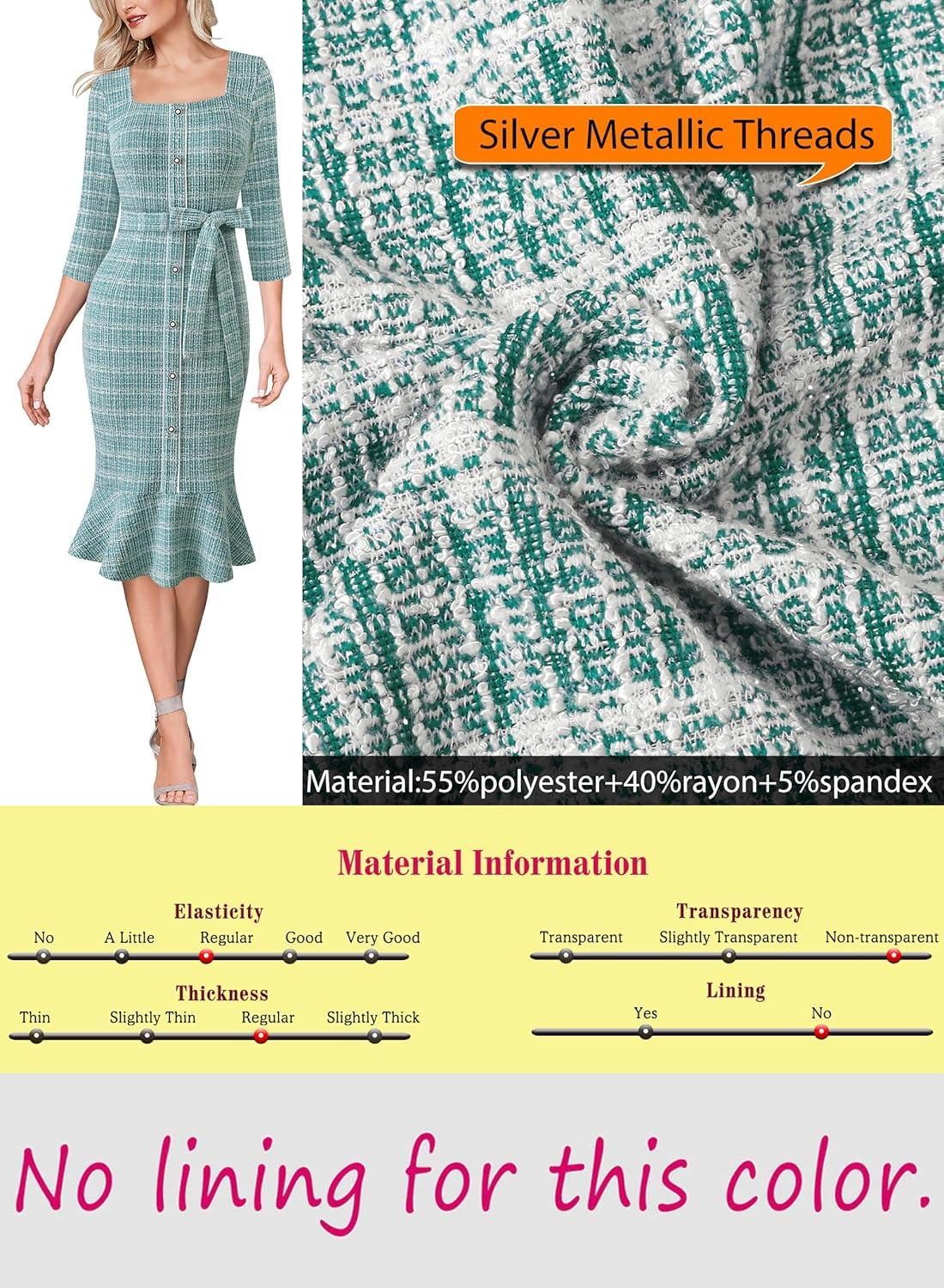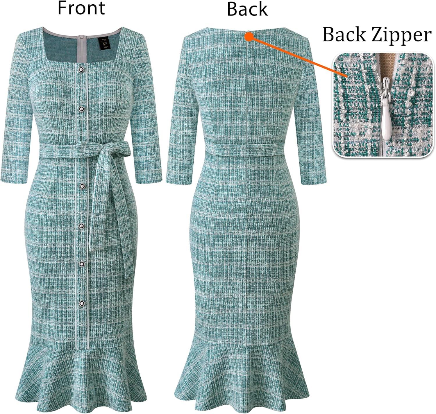 VFSHOW Womens Business Square Neck Button Belted Colorblock Patchwork Office Work Slim Sheath Mermaid Dress(Teal Green Tweed)
