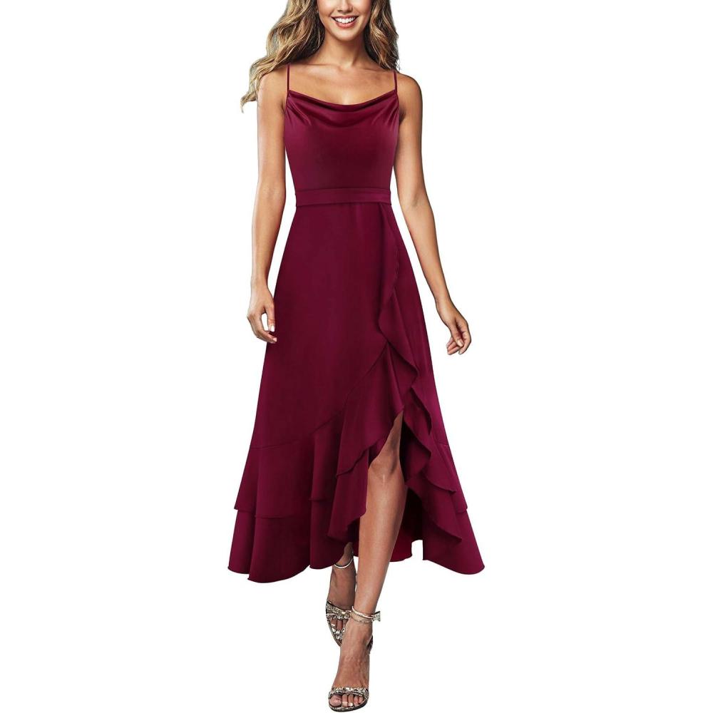 image:imageVFSHOW Womens Cowl Neck Cocktail Formal Wedding Guest Elegant High Low Ruffle Slit Evening Party A Line Long DressDark Red
