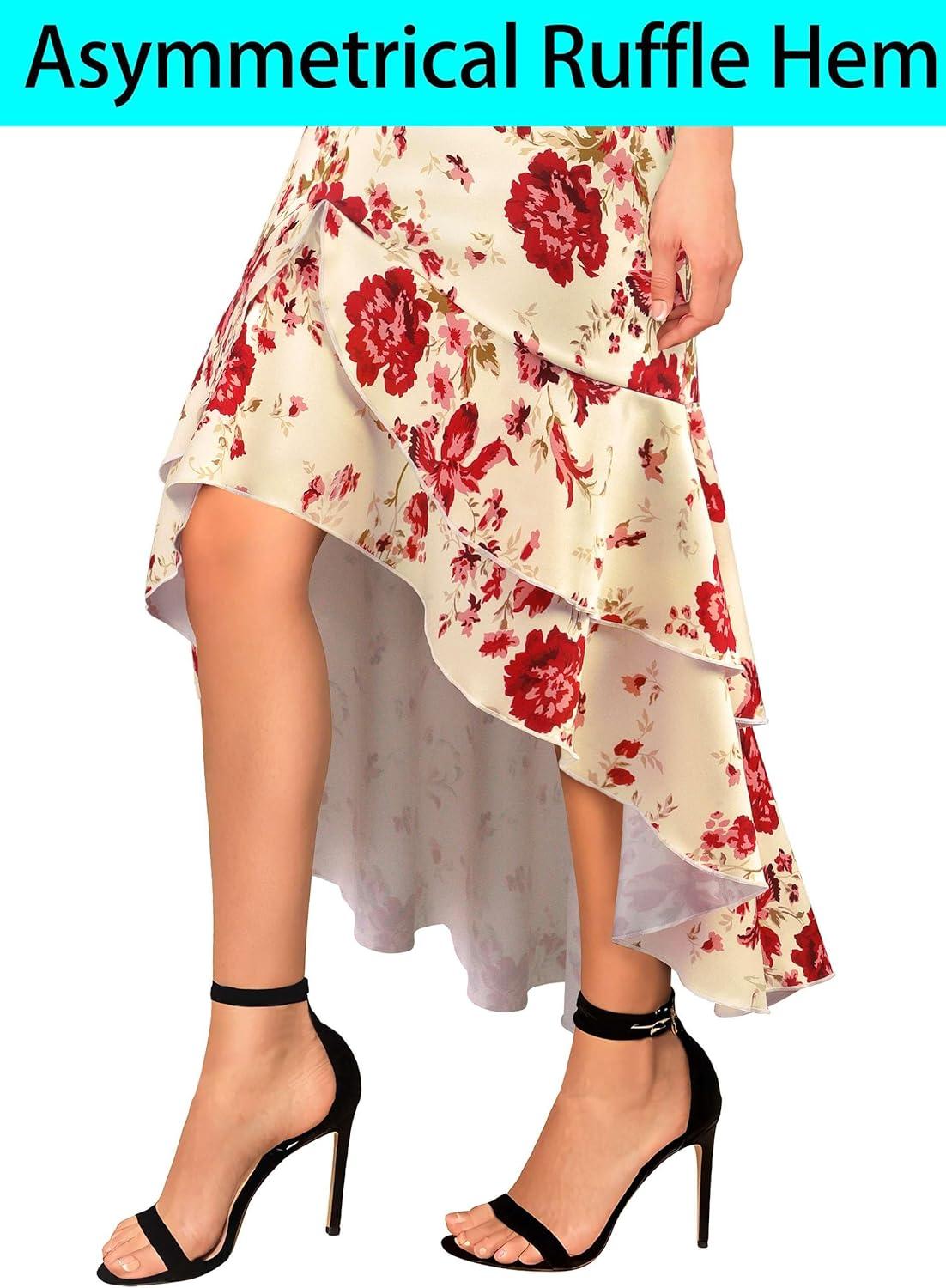 VFSHOW Womens Formal Double Layer Ruffle High Low Maxi Dress 2025 Sexy Backless V Neck Spaghetti Strap Wedding Guest Dresses(Beige With Red Floral Print)