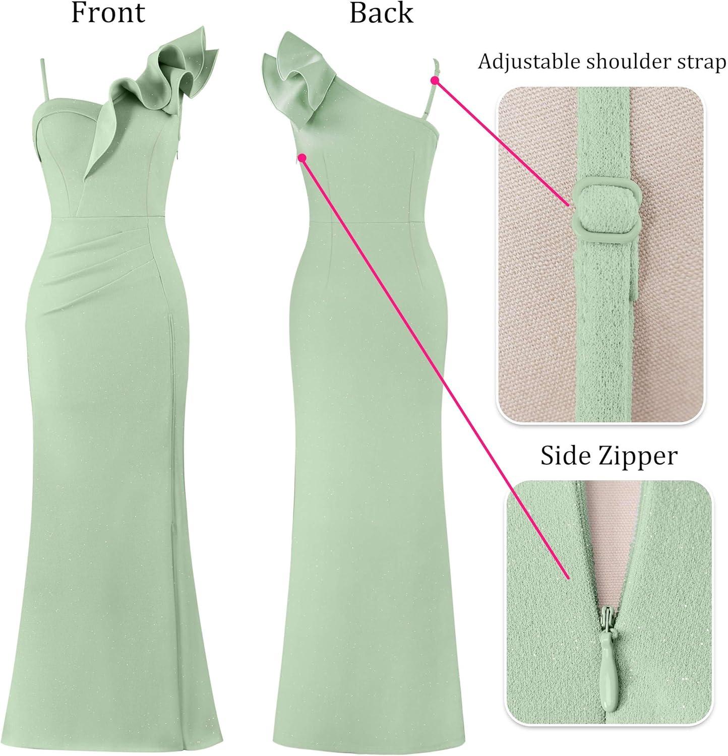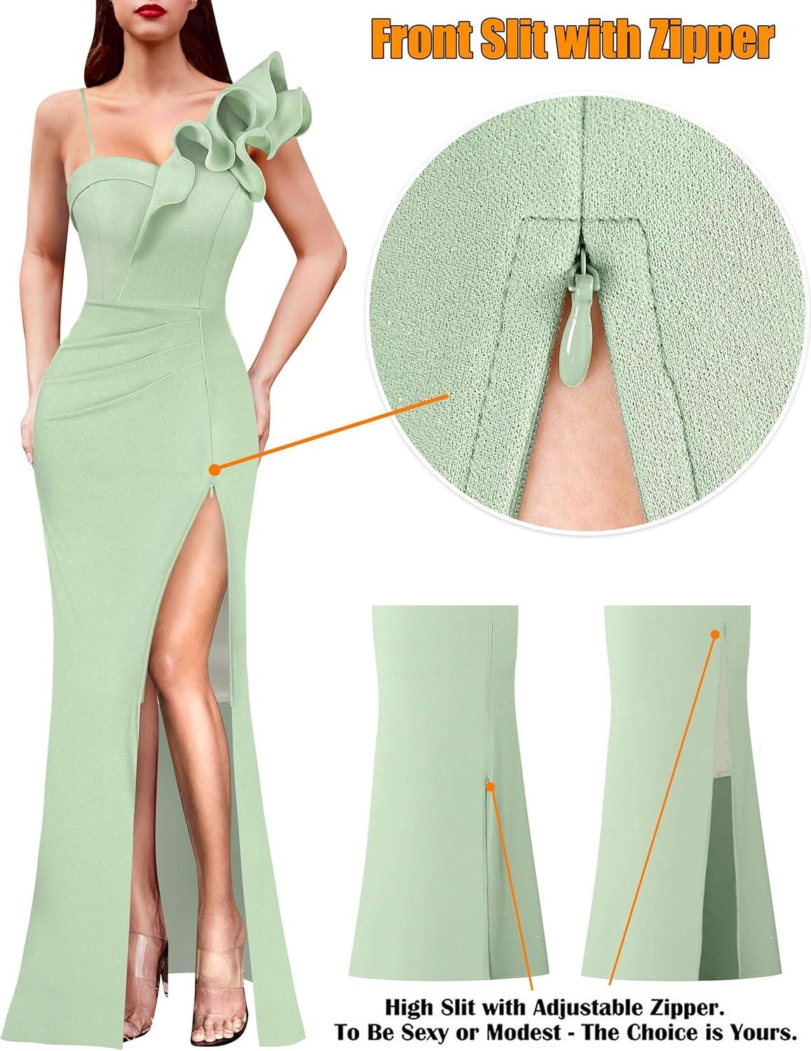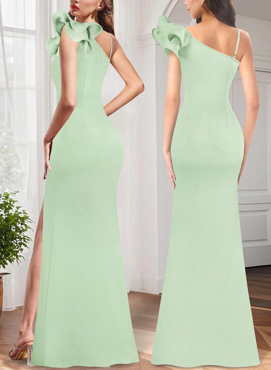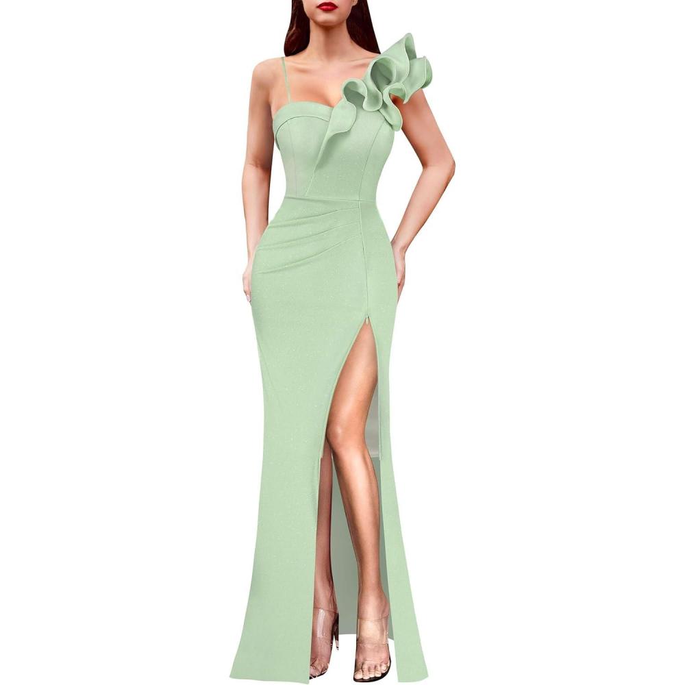 VFSHOW Womens Formal Prom Ruffle One Shoulder Strap Ruched Maxi Dress 2025 Sexy Twist Front Split Wedding Guest Evening Gown(Light Green)