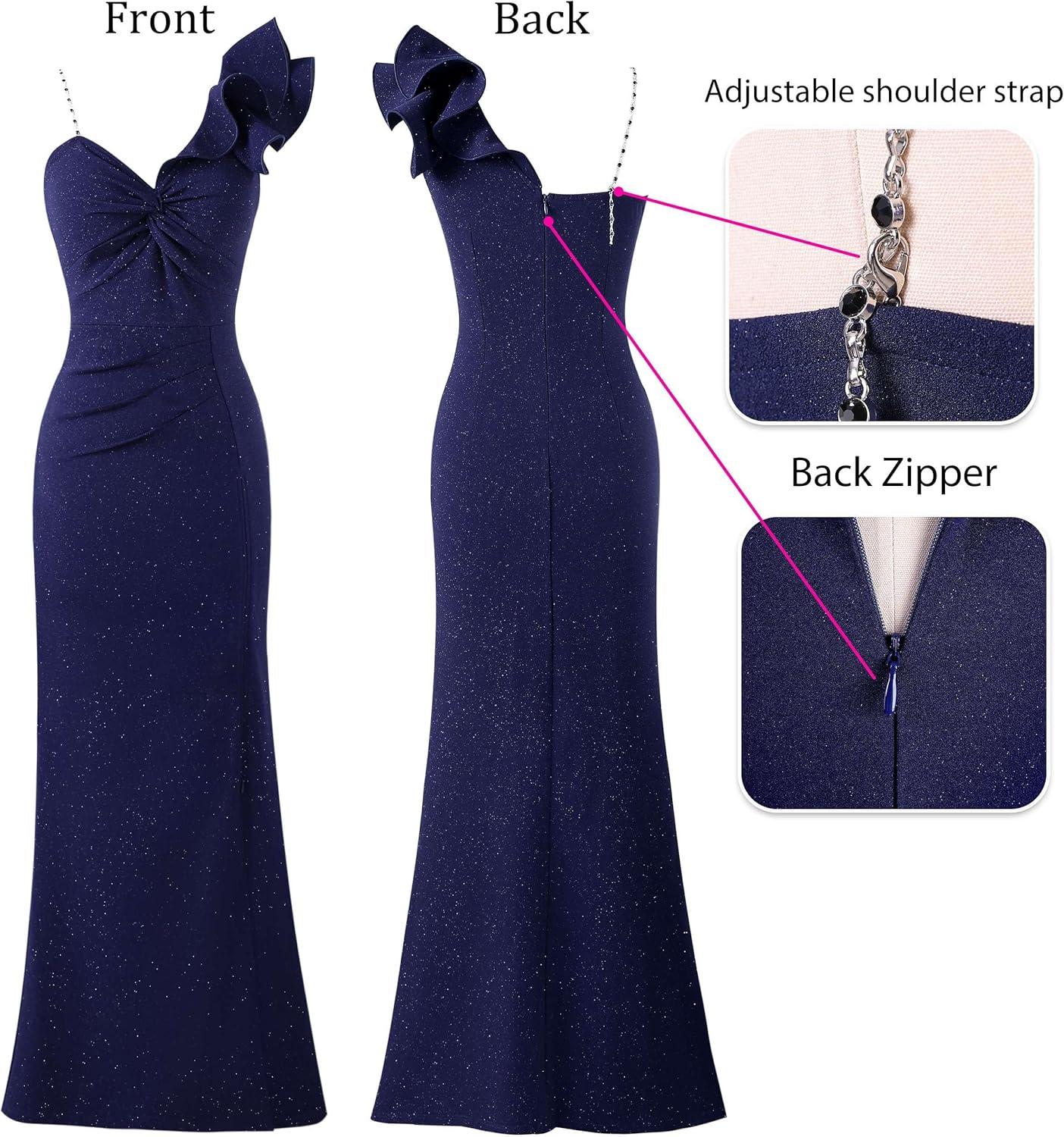 VFSHOW Womens Formal Prom Ruffle One Shoulder Strap Ruched Maxi Dress 2025 Sexy Twist Front Split Wedding Guest Evening Gown(Sparkly Navy Blue)