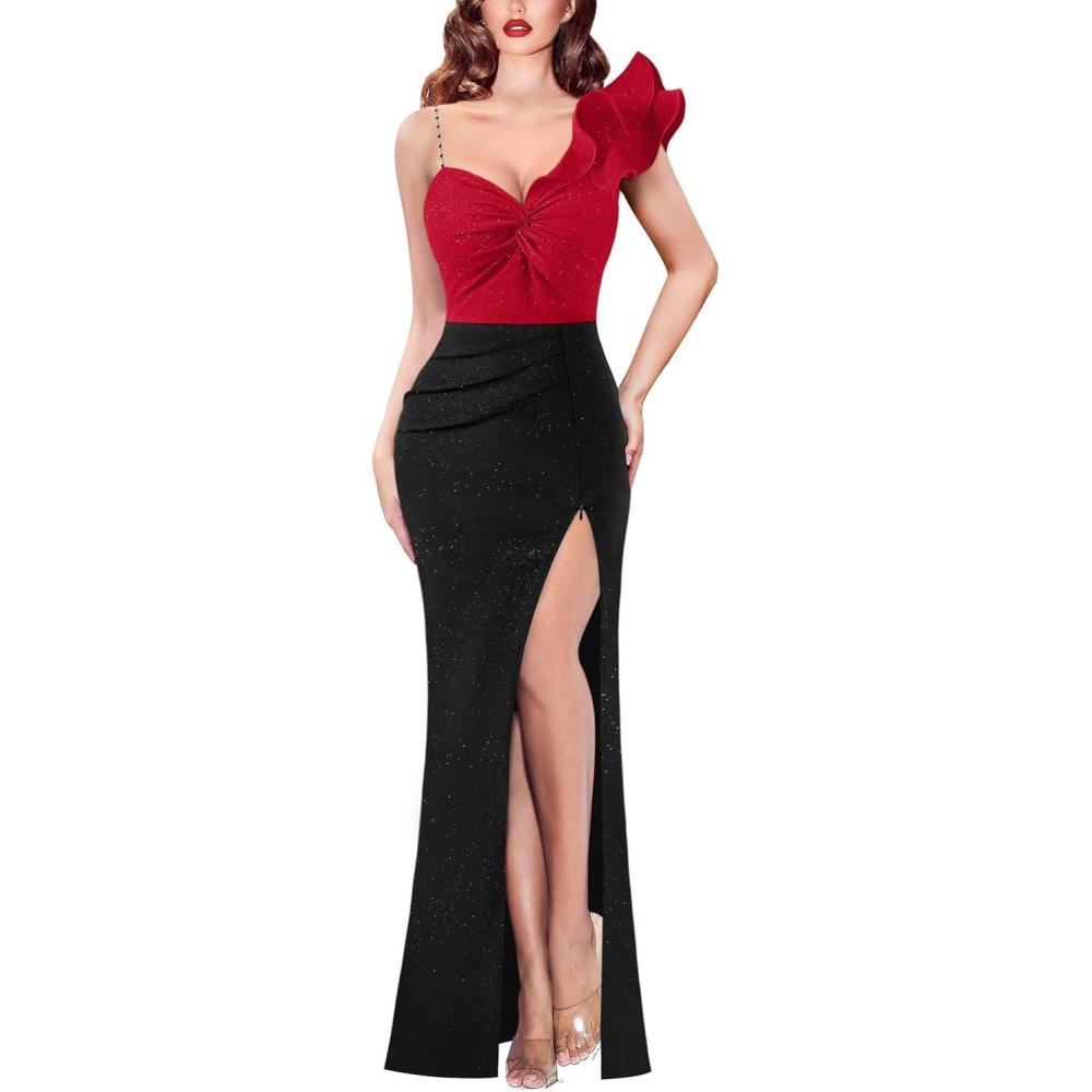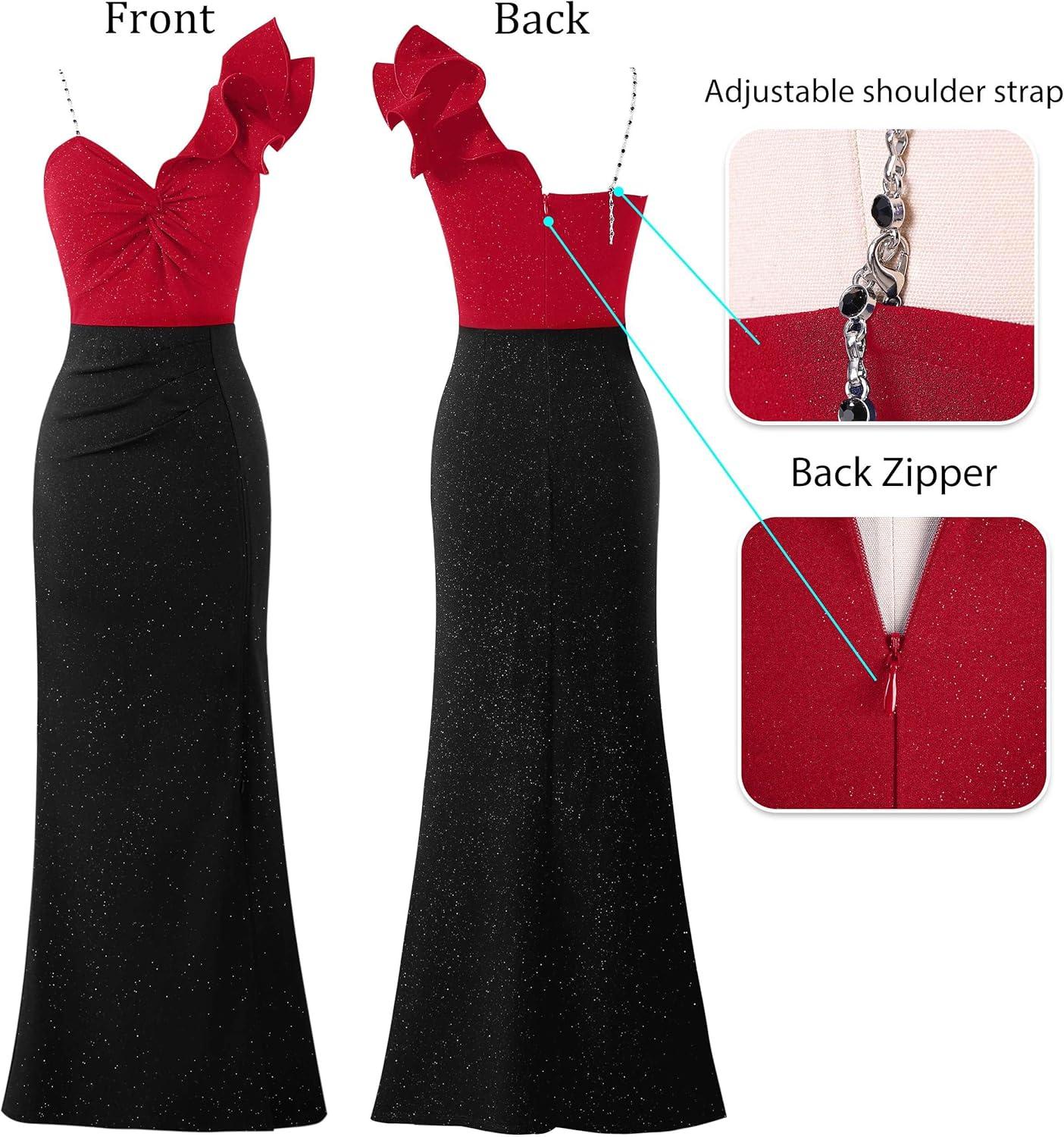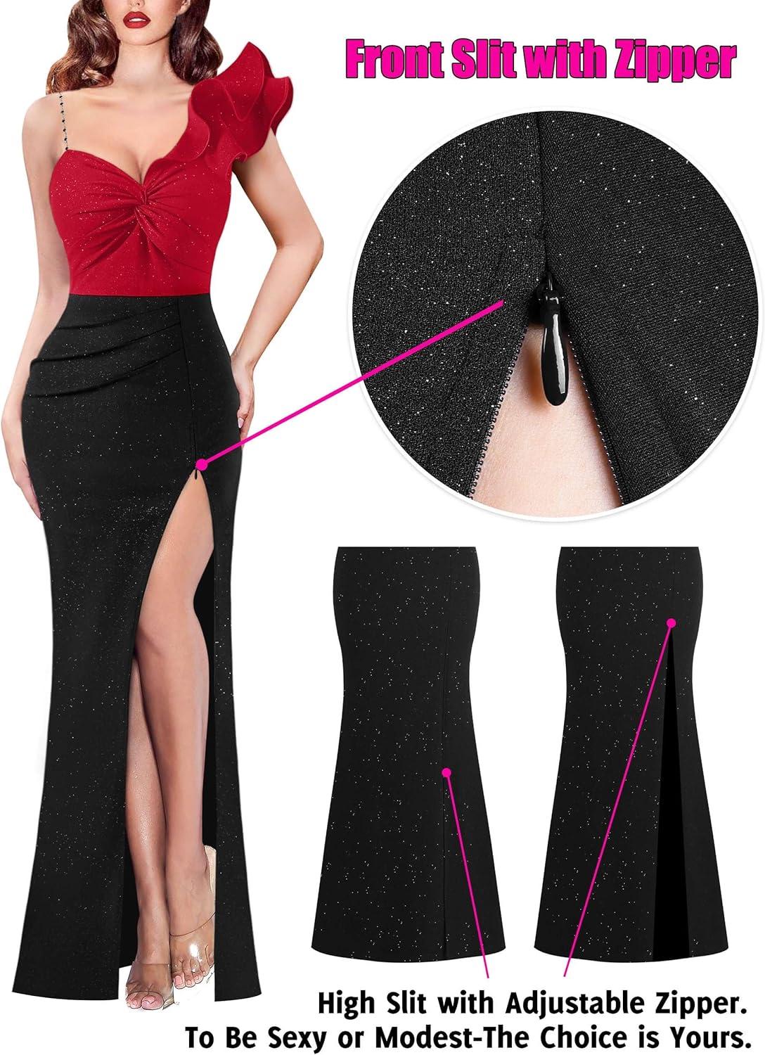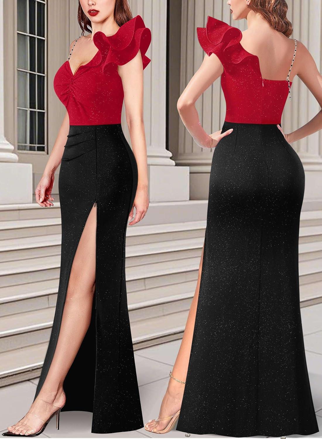 VFSHOW Womens Formal Prom Ruffle One Shoulder Strap Ruched Maxi Dress 2025 Sexy Twist Front Split Wedding Guest Evening Gown(Sparkly Red and Black)
