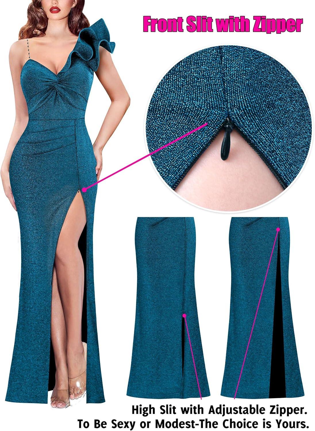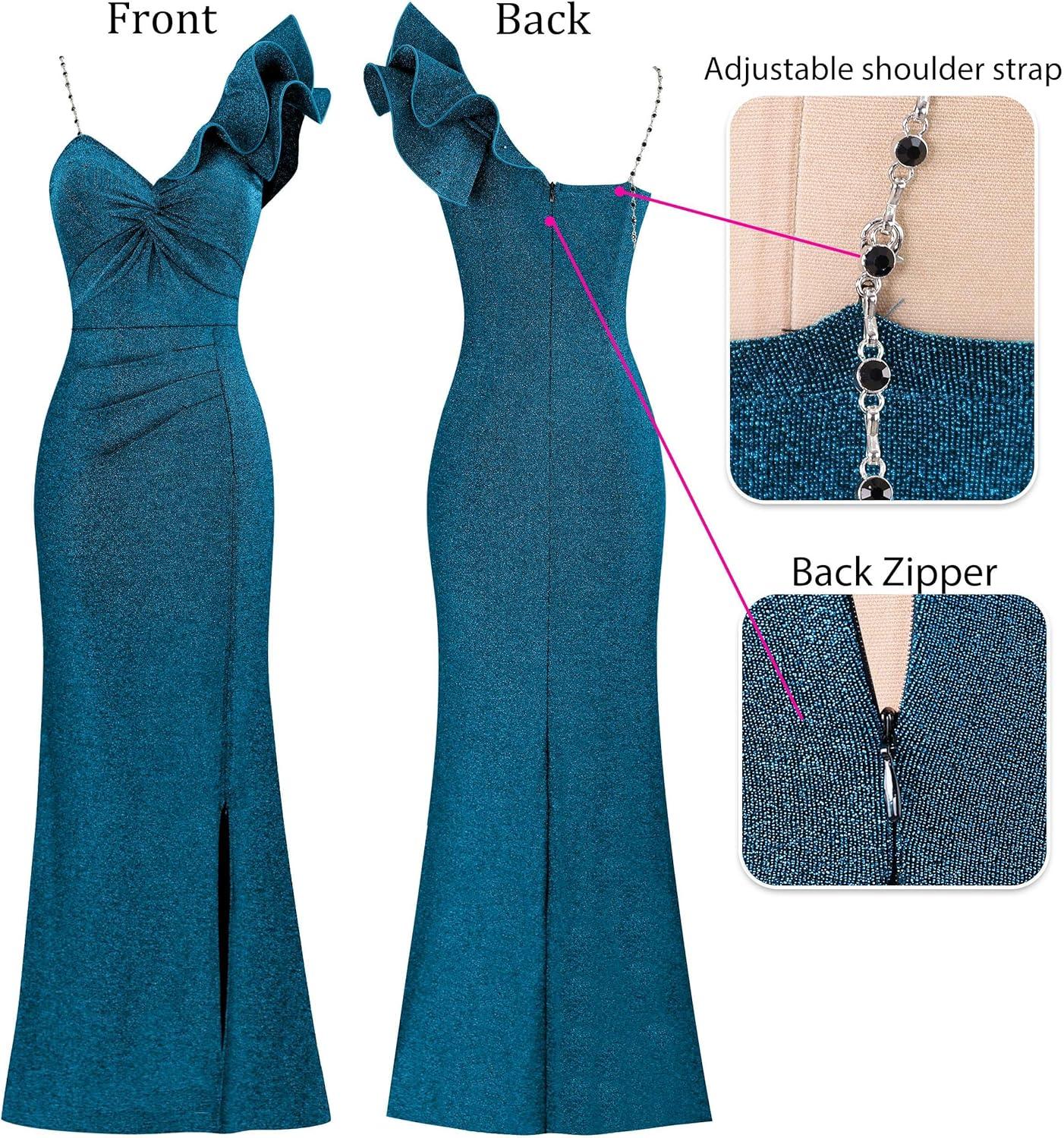 VFSHOW Womens Formal Prom Ruffle One Shoulder Strap Ruched Maxi Dress 2025 Sexy Twist Front Split Wedding Guest Evening Gown(Sparkly Teal Blue)