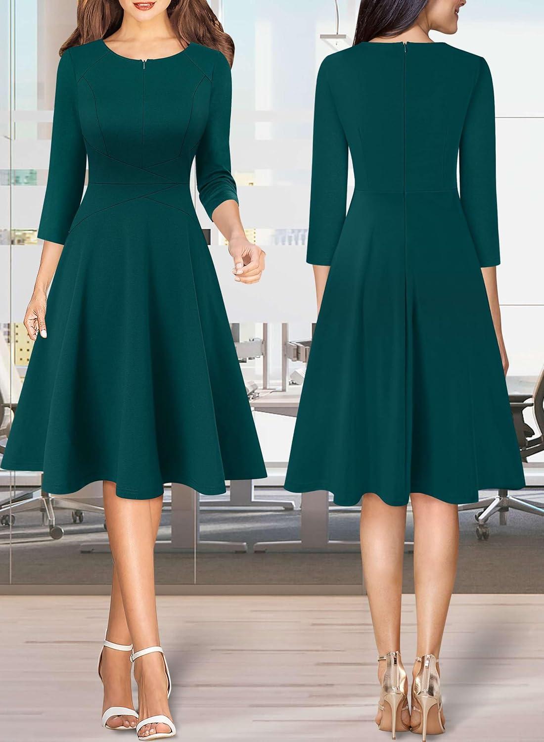 VFSHOW Womens Front Zipper Crisscross Waist Slim Wear to Work Business Office Fit and Flare A-Line Dress(Dark Green)