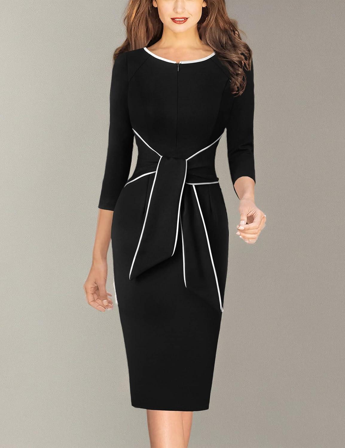 VFSHOW Womens Front Zipper Tie Waist Bow 3/4 Sleeve Slim Fitted Work Business Office Party Bodycon Pencil Sheath Dress(Black and White Piping)