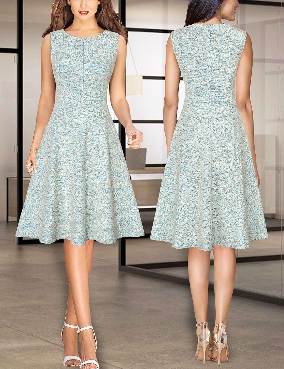 VFSHOW Womens Front Zipper Work Business A-Line Dress Elegant Professional Office Career Church Fit and Flare Skater Dresses(Blue+off White Tweed)