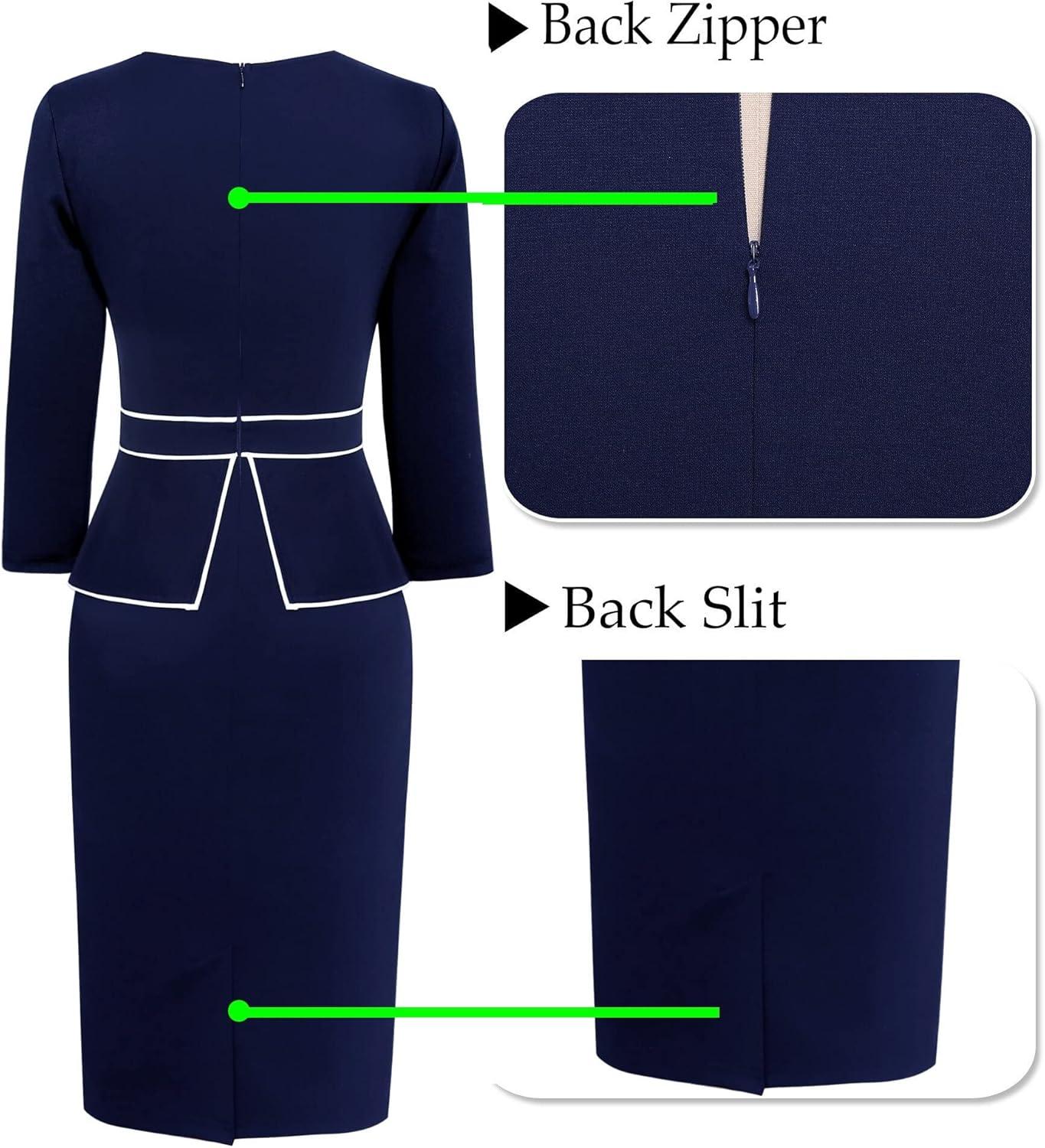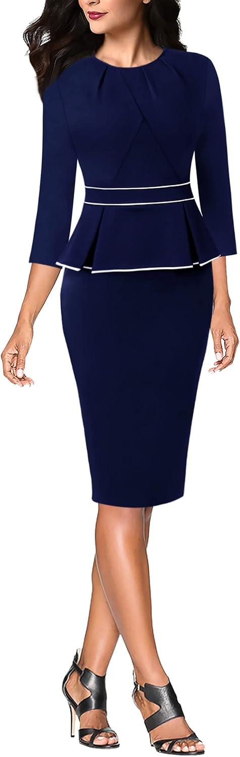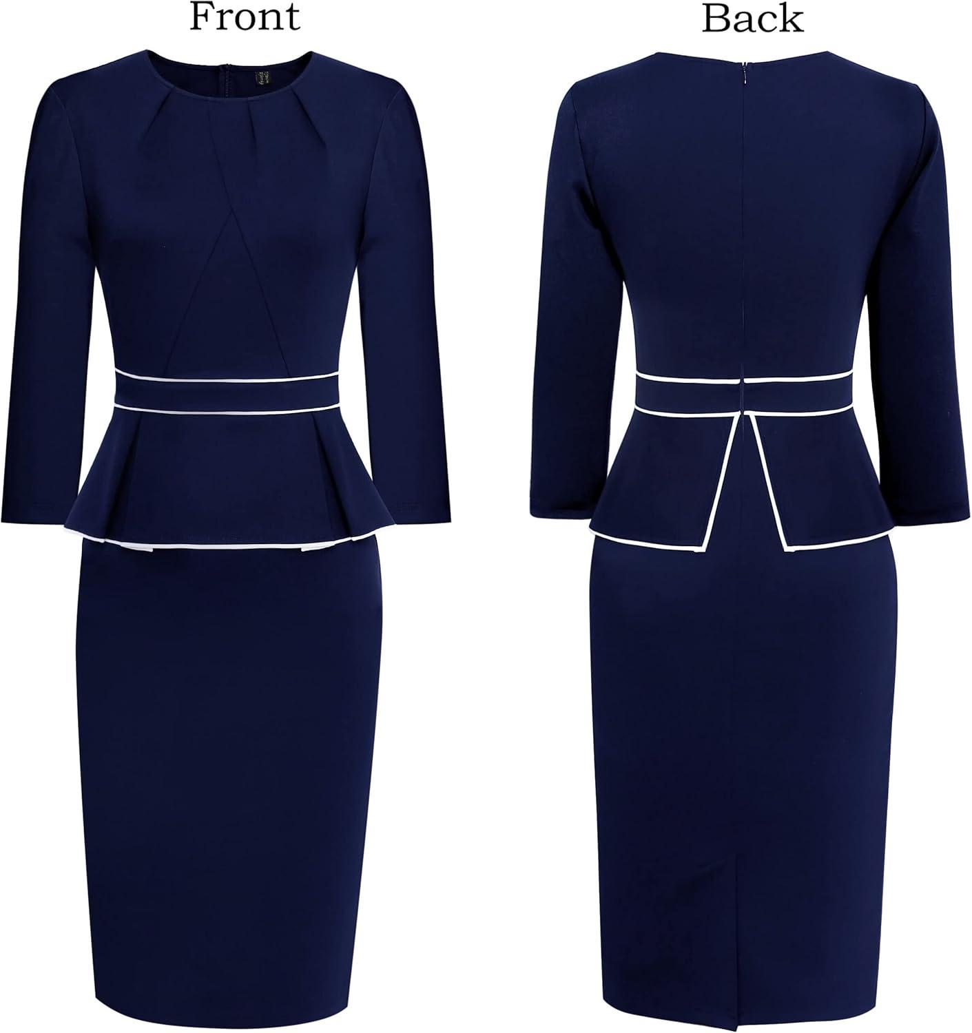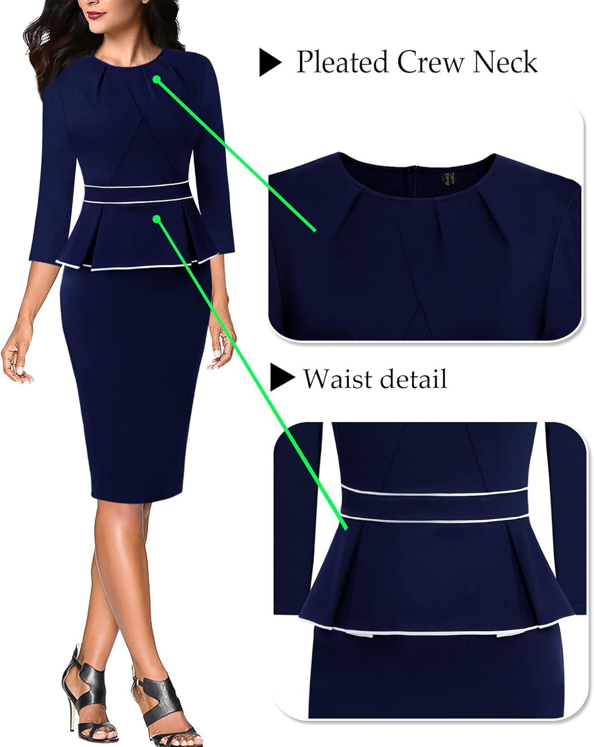 image:imageVFSHOW Womens Pleated Crew Neck Peplum Slim Work Business Dress Elegant 34 Sleeves Office Church Bodycon Pencil Sheath DressBlue With White Piping