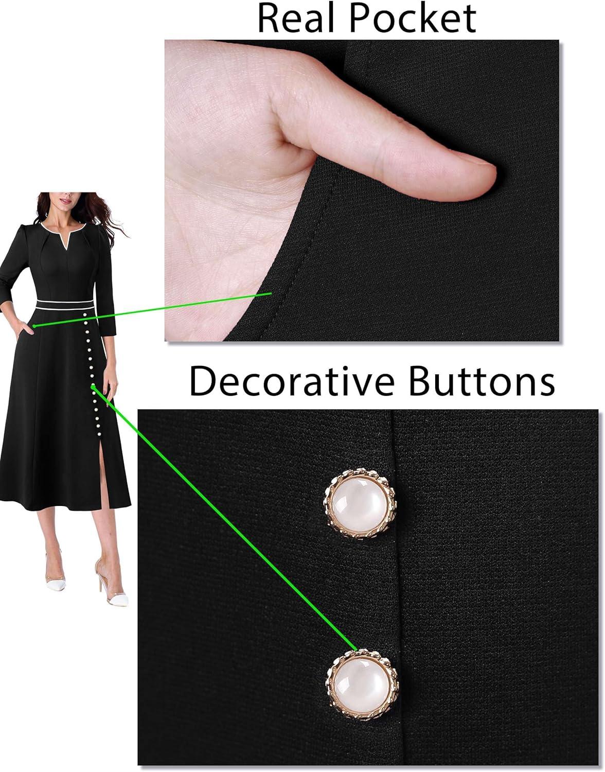 VFSHOW Womens Pleated Notch V Neck Front Slit Buttons Pockets Office Business Work Slim A-line Fit and Flare Midi Dress(Black With White Piping)