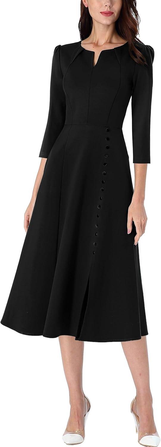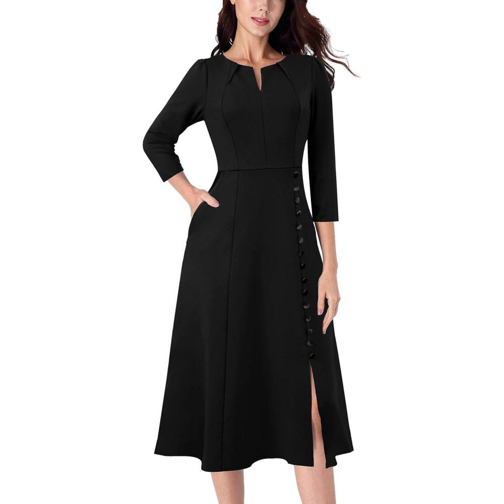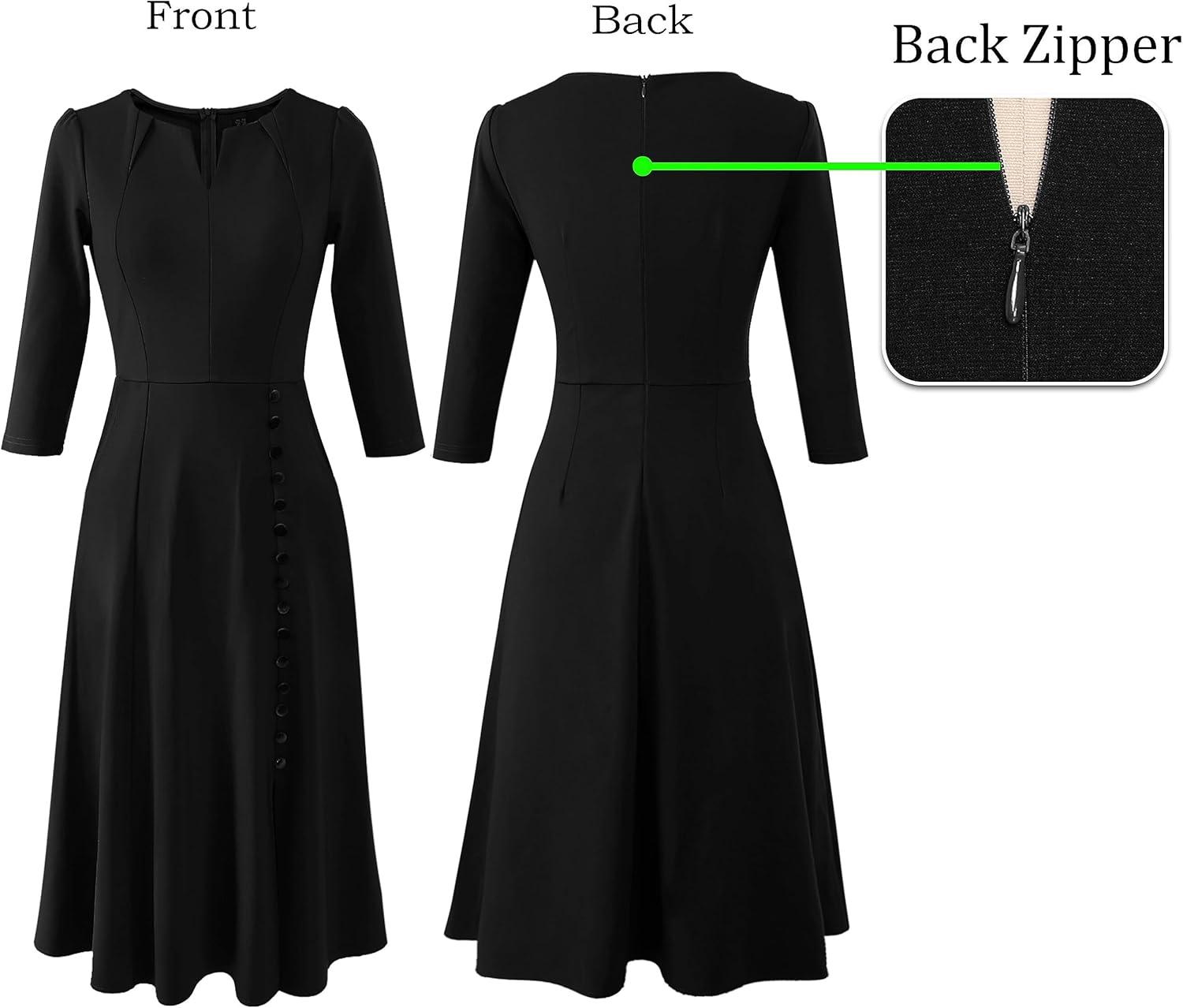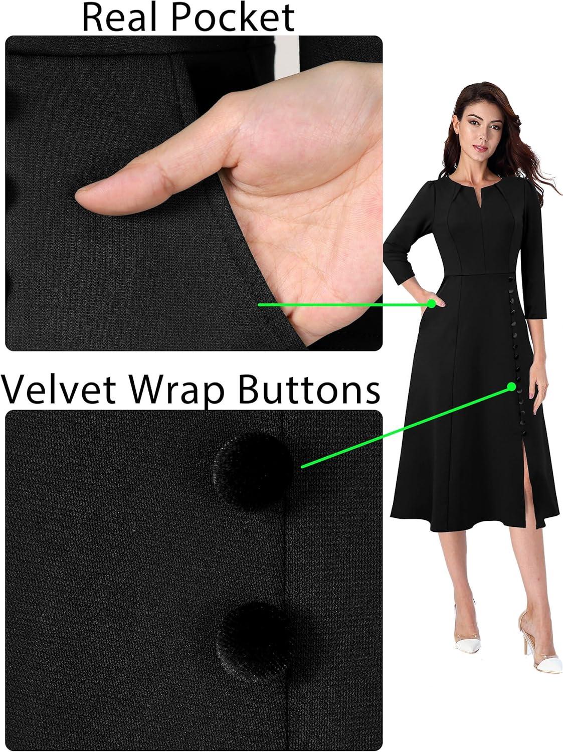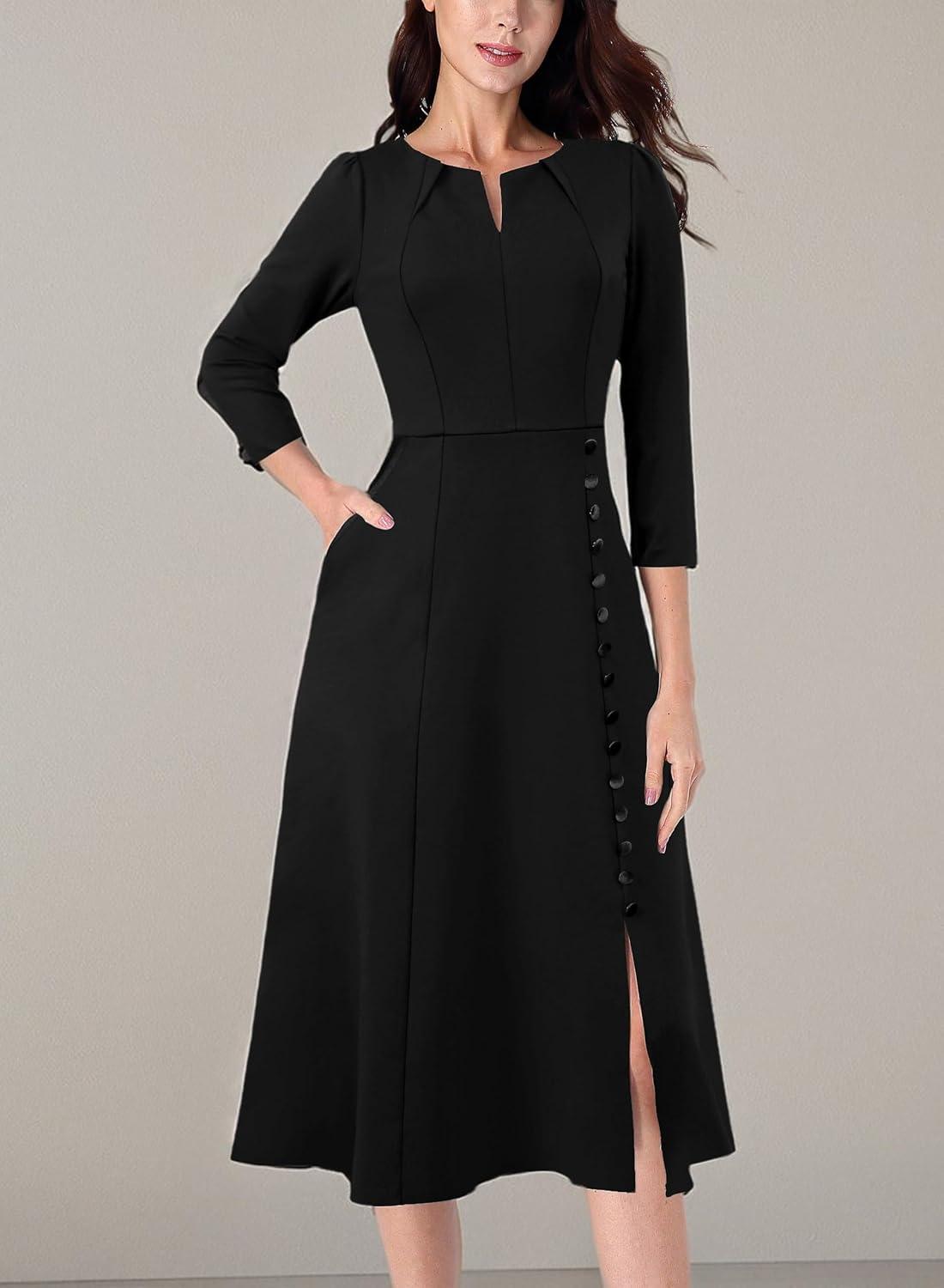 VFSHOW Womens Pleated Notch V Neck Front Slit Buttons Pockets Office Business Work Slim A-line Fit and Flare Midi Dress(Black)
