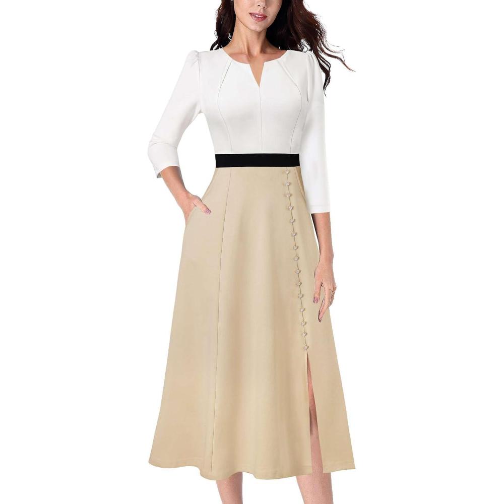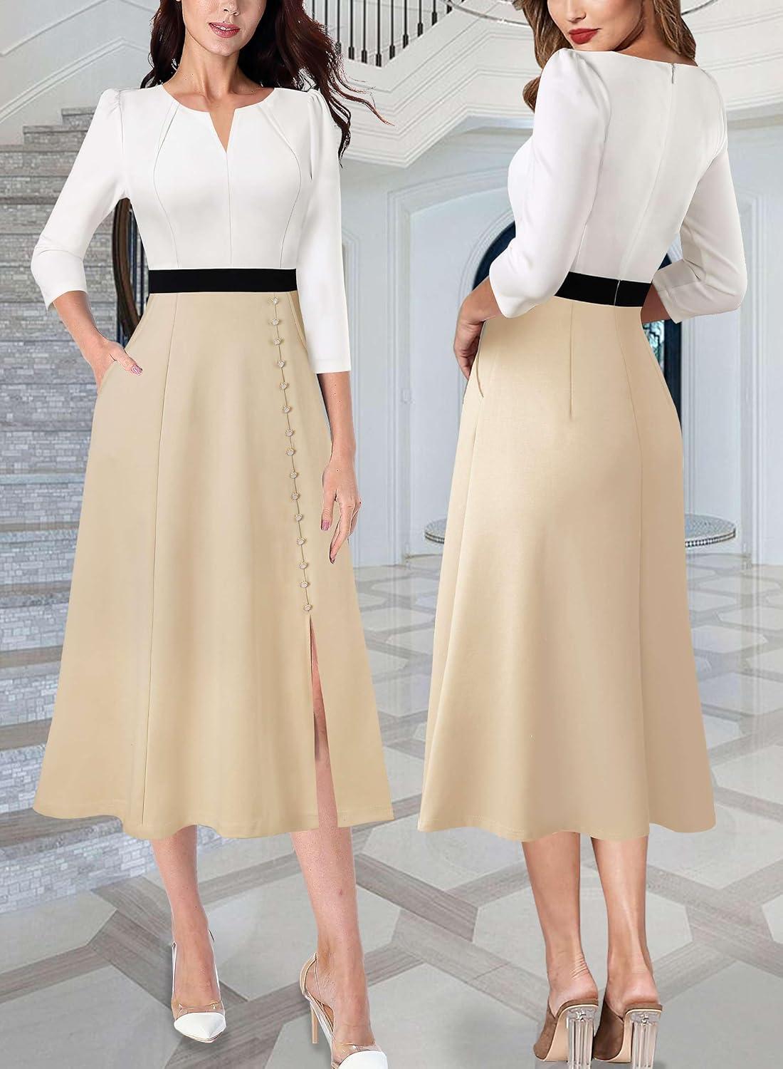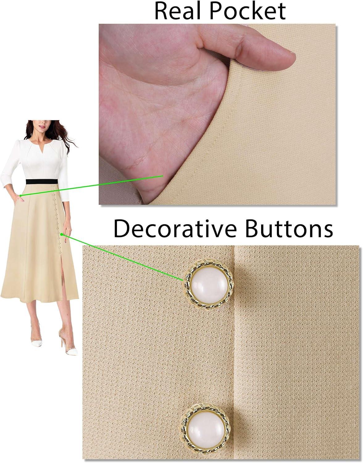 VFSHOW Womens Pleated Notch V Neck Front Slit Buttons Pockets Office Business Work Slim A-line Fit and Flare Midi Dress(Off-white+black+beige)
