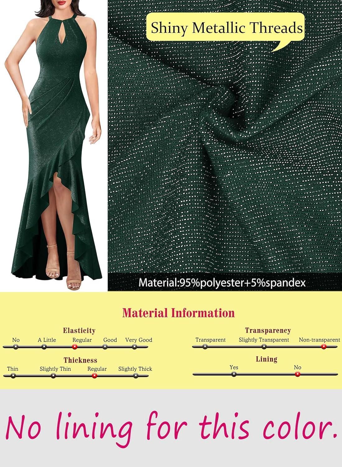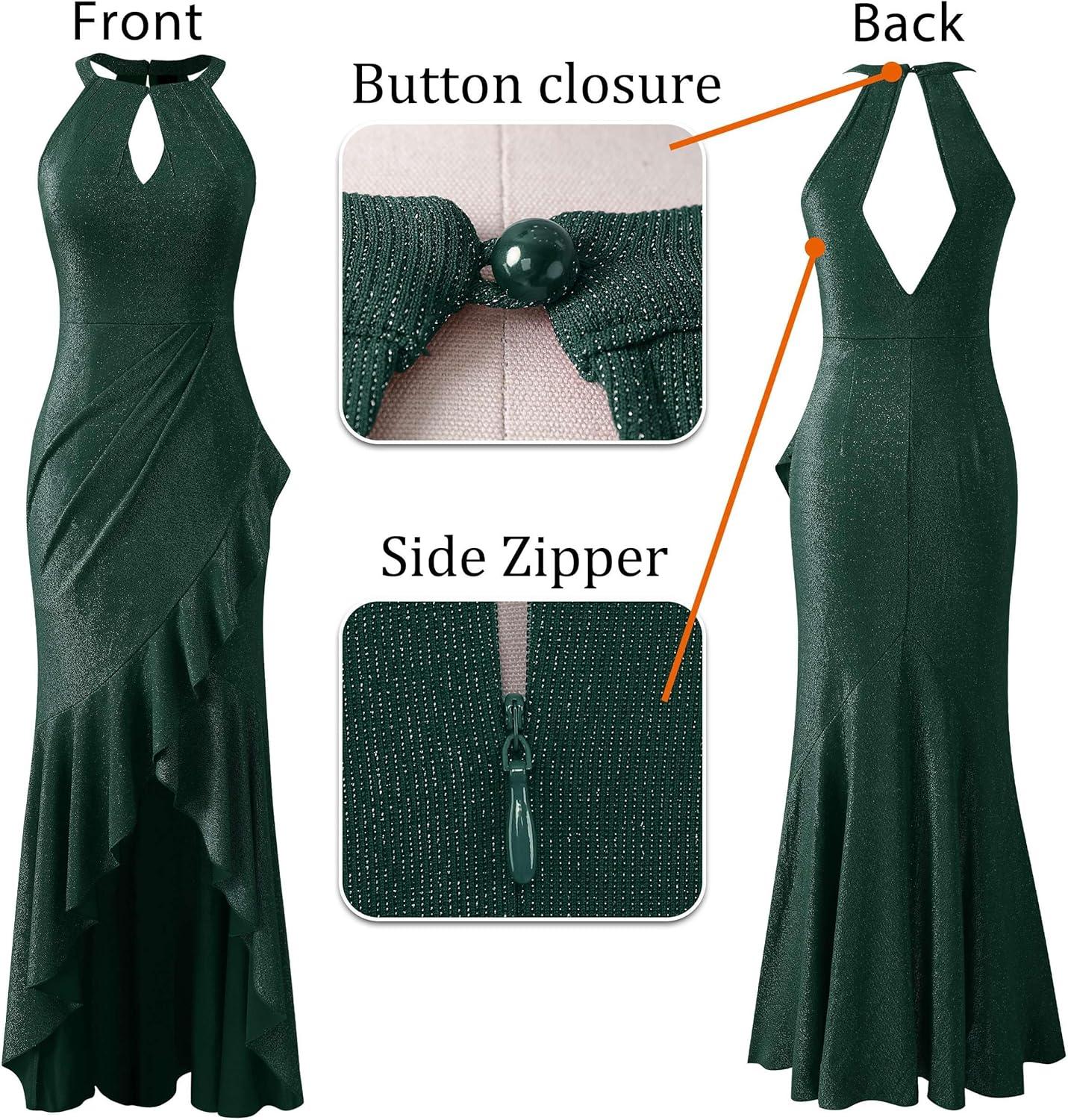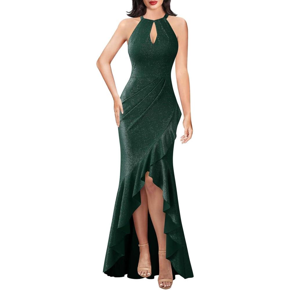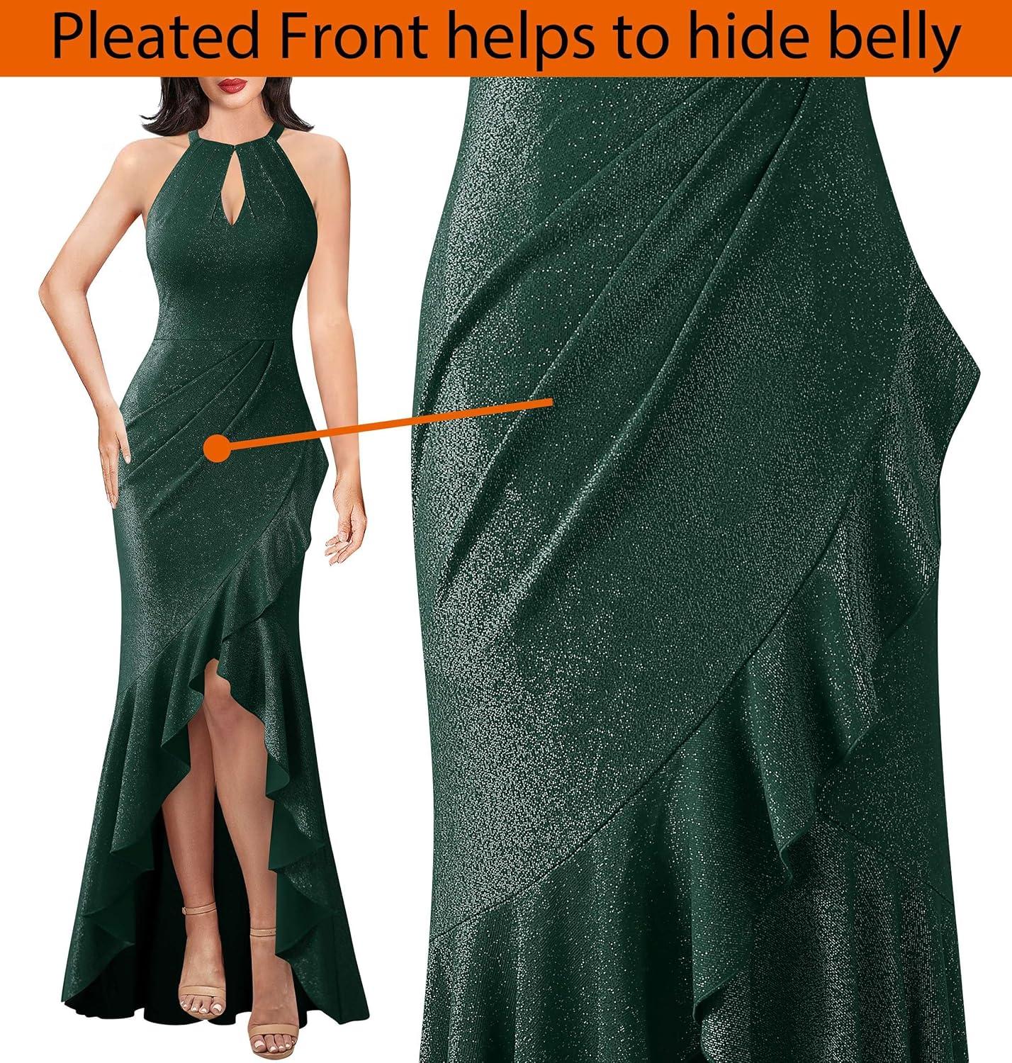 VFSHOW Womens Sexy Halter Neck Formal Cutout Ruffle Slit Ruched Prom Maxi Dress Wedding Guest HI-LO Mermaid Evening Gown(Sparkly Green)