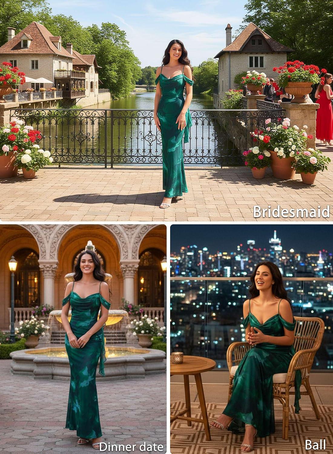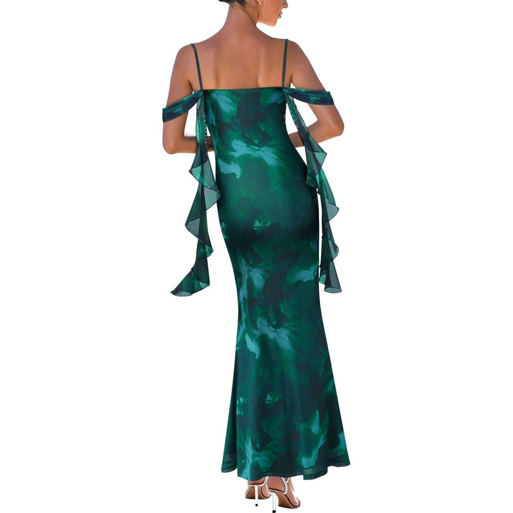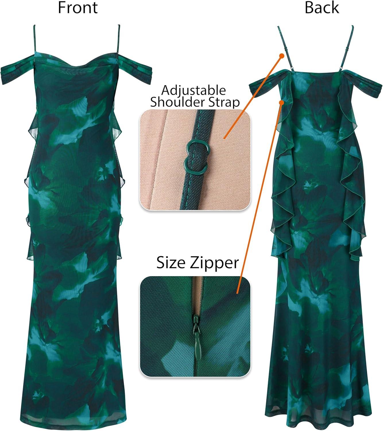 VFSHOW Womens Spaghetti Strap Ruffle Ruched Bodycon Maxi Dress 2025 Sexy Cold Shoulder Fitted Formal Long Cocktail Dress(Green Floral Print)
