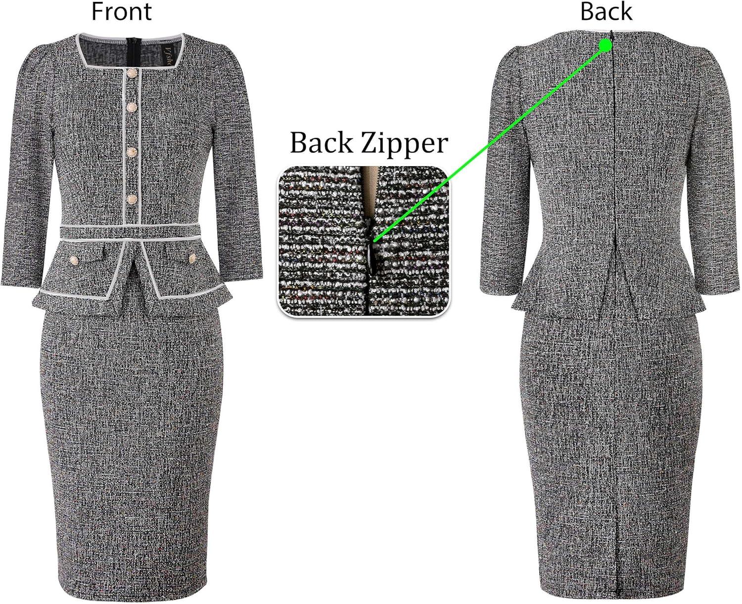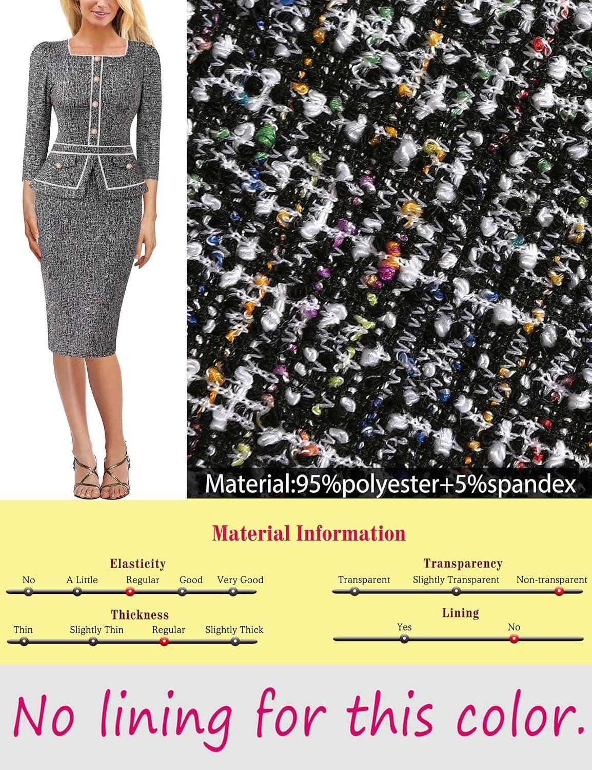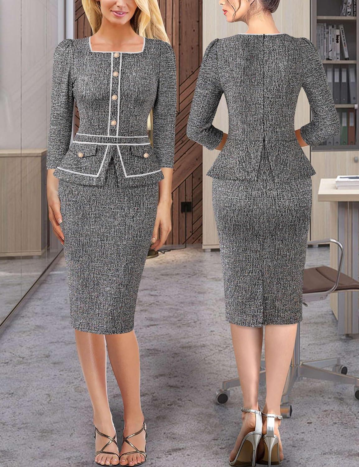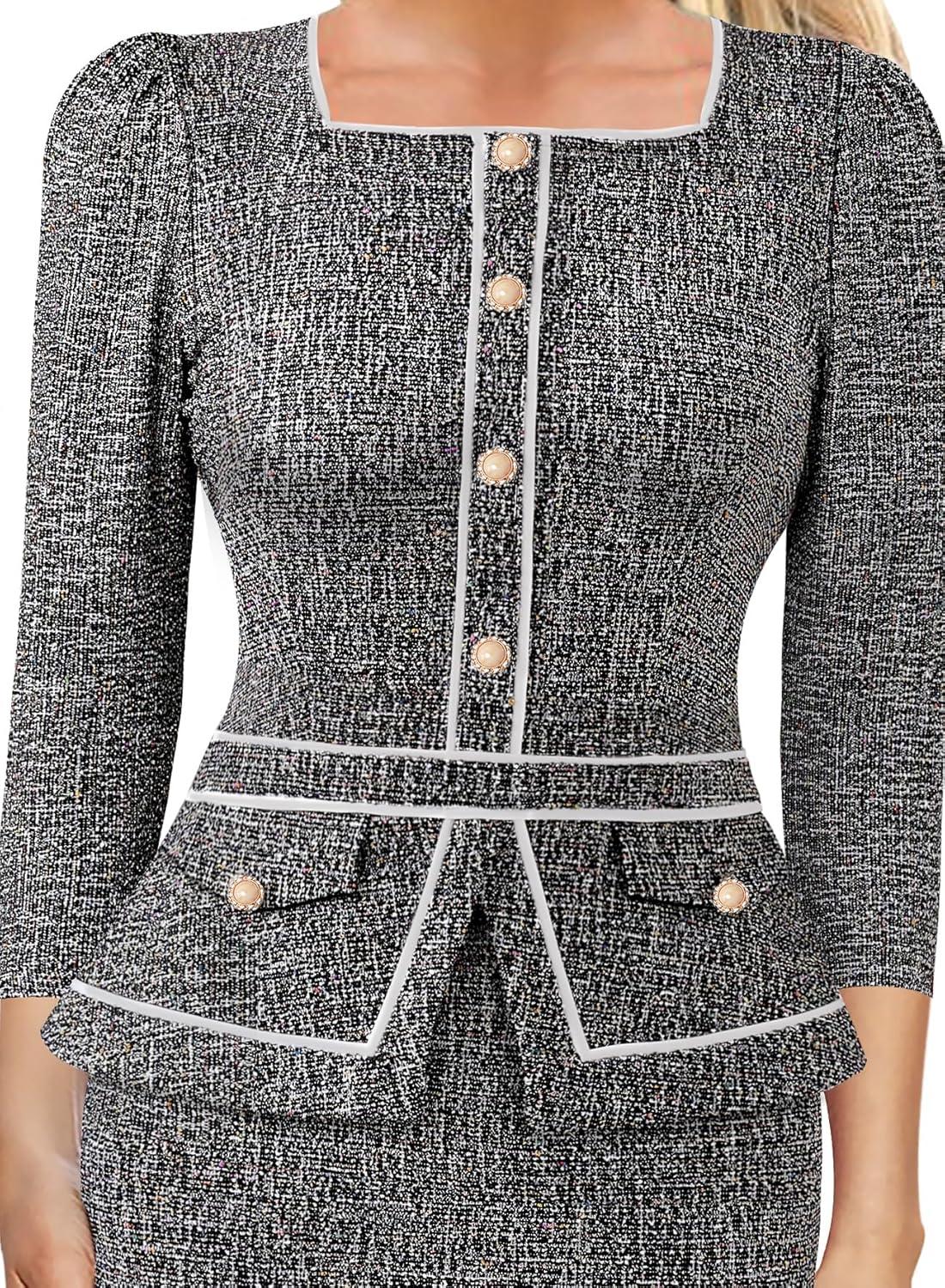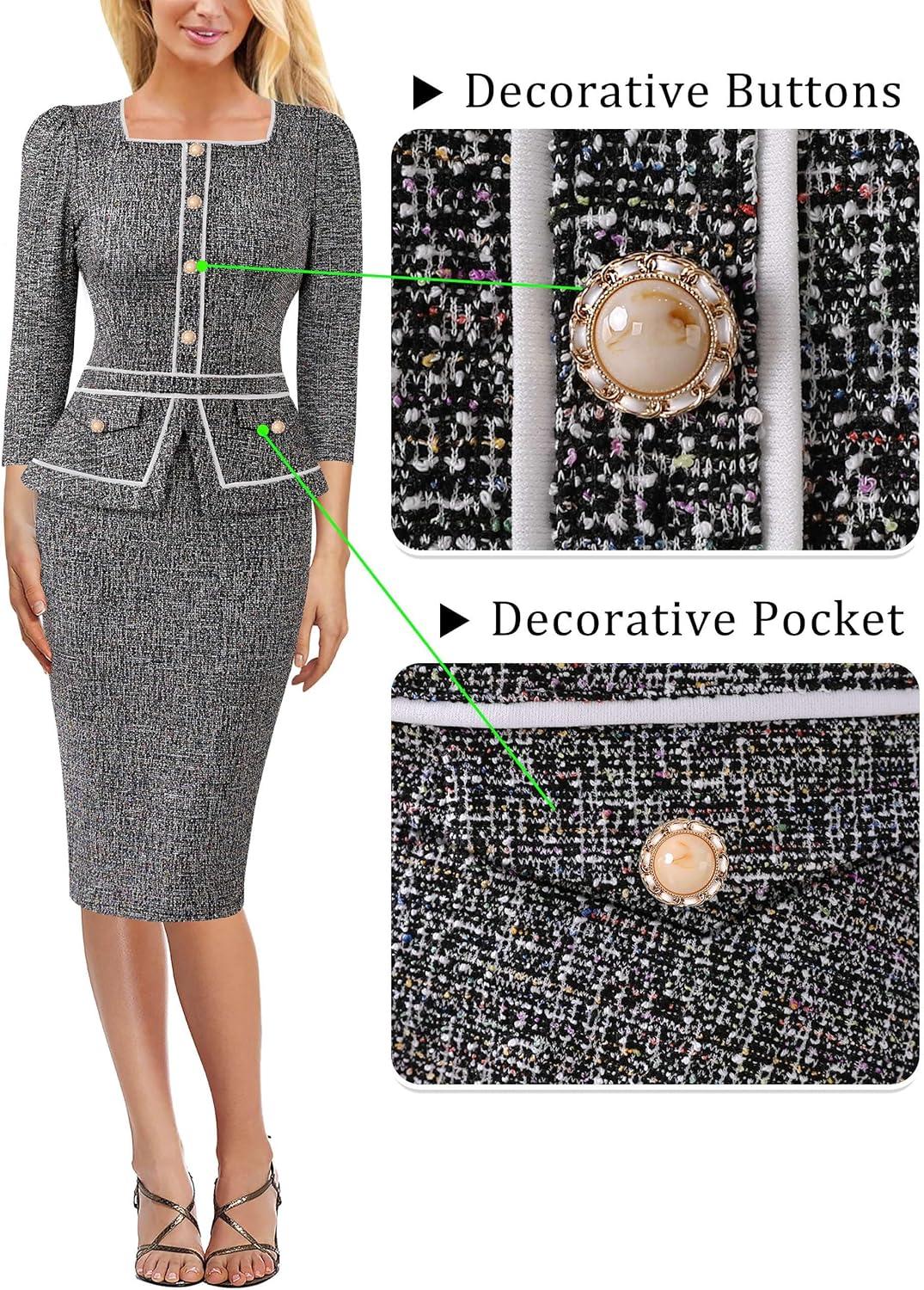 VFSHOW Womens Square Neck Buttons Peplum Cocktail Party Work Office Business Bodycon Pencil Dress(Black Tweed + Black)