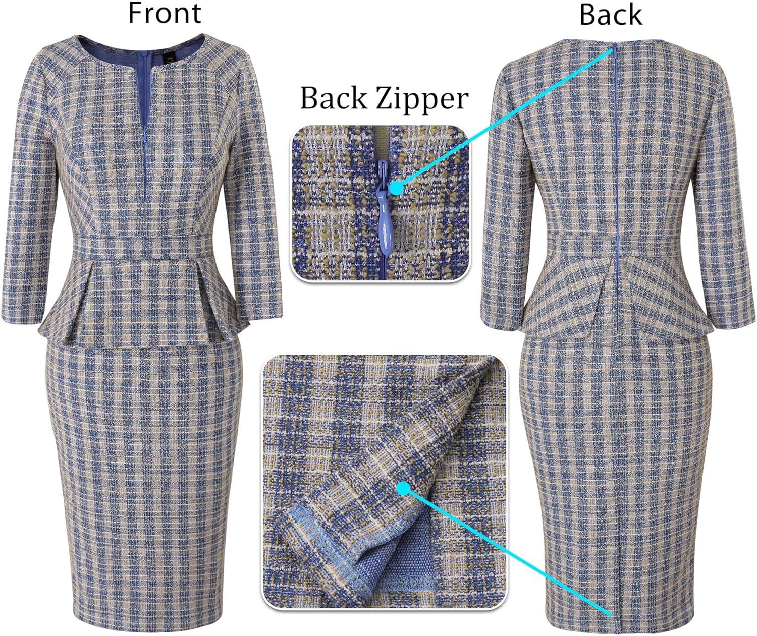 VFSHOW Womens Wear to Work Front Zipper V Neck Peplum Business Office Church Flattering Pencil Sheath Dress(Blue Tweed)