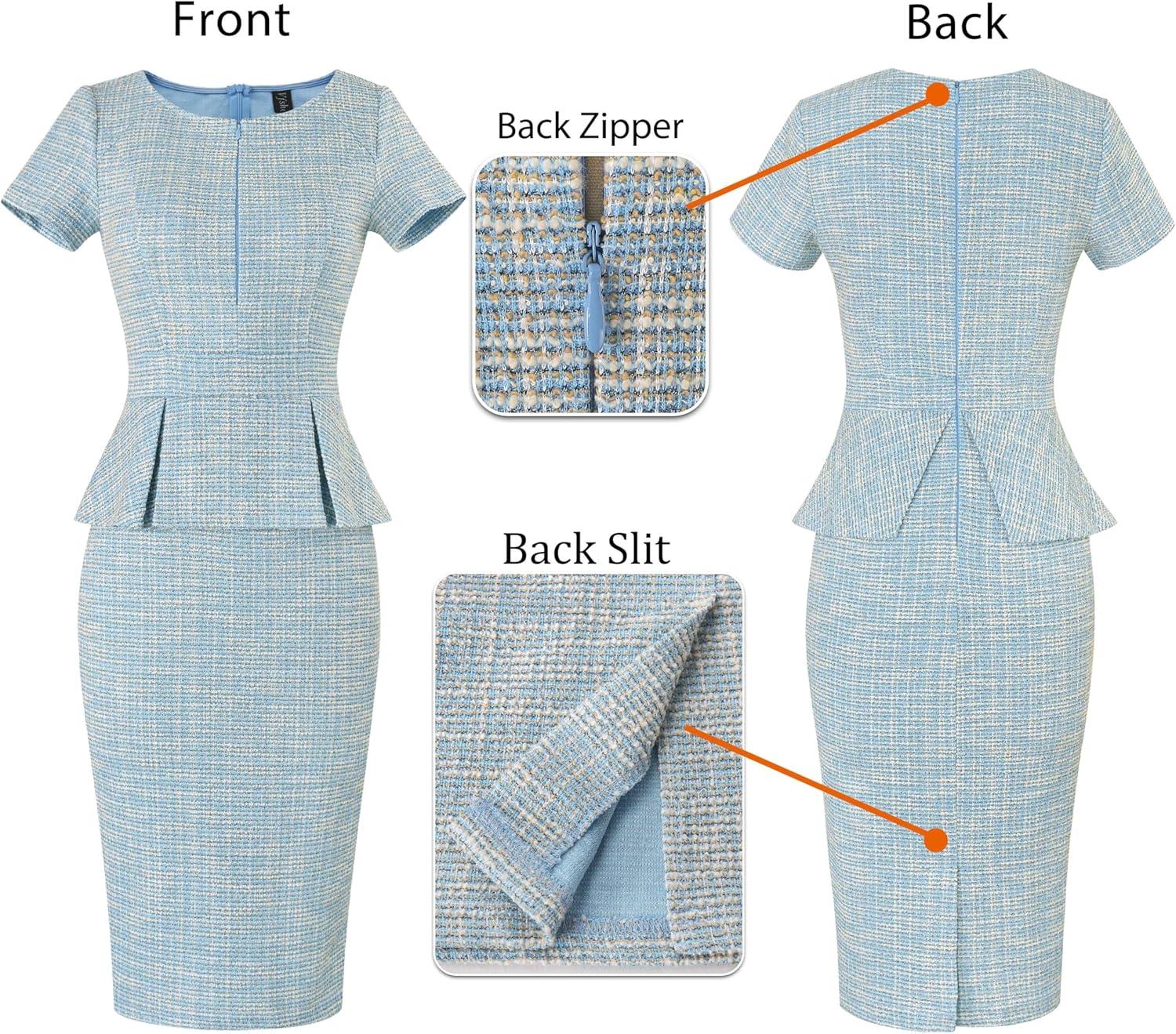 VFSHOW Womens Work Business Office Front Zipper Peplum Bodycon Dresses Elegant Short Sleeve Slim Church Pencil Sheath Dress(Light Blue Tweed-b)